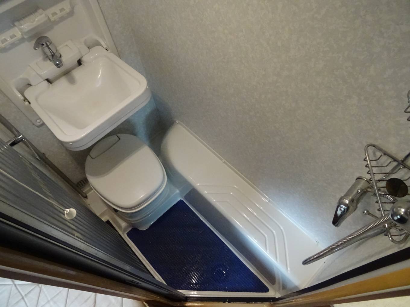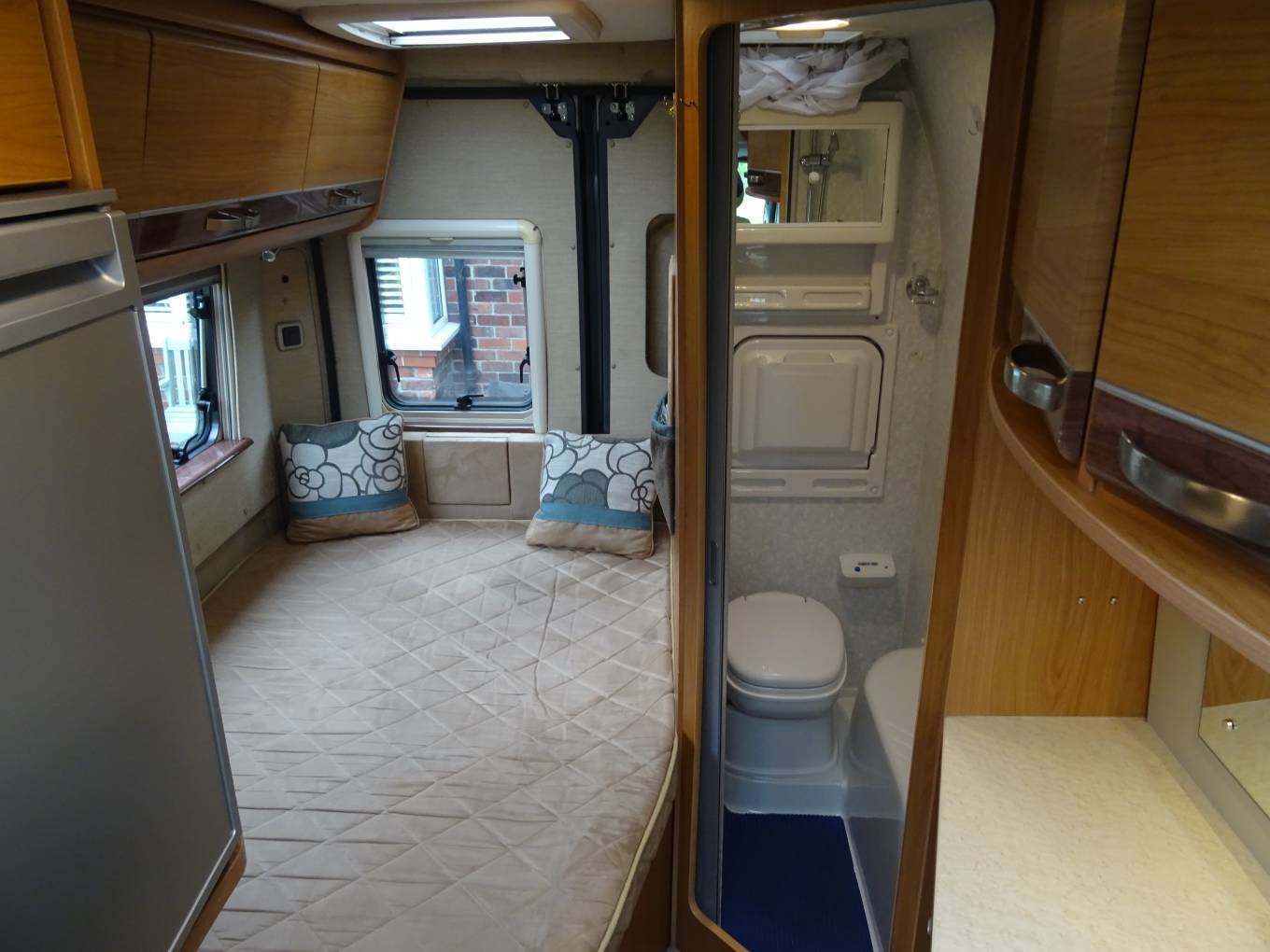 Starting with the rear of the motorhome, you have a wonderfully presented rear fixed French bed surrounded by multiple spot lights with plenty of storage space in the overhead cupboards. There is also plenty of storage space underneath the bed which can be accessed from either inside the motorhome or from the rear doors. Also at the rear next to the bed is the substantial washroom which includes a sink with mixer tap, cupboards, toilet and a full length shower.