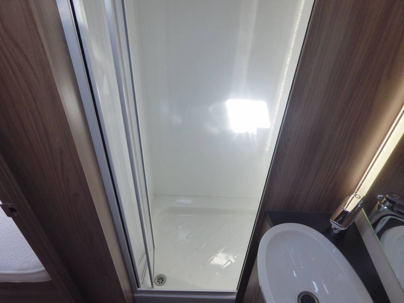 At the rear is a bathroom, with a toilet, a hand basin, and a shower cubicle.