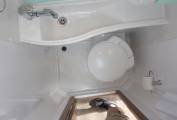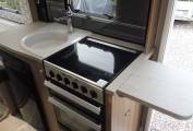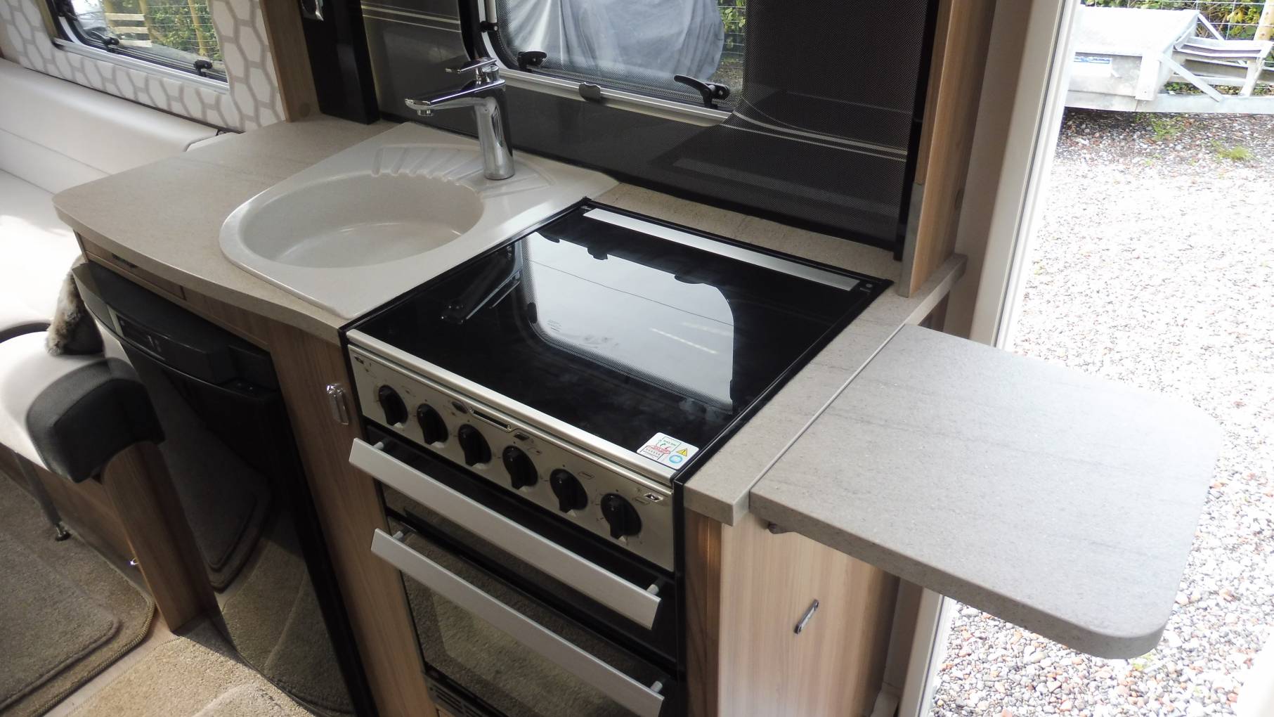 The side kitchen offers everything you would expect in a larger motorhome – dual-fuel hob, grill, full oven, automatic 3-way fridge, microwave, sink with removable drainer and an extending worksurface. Opposite which is a decent washroom with vanity sink unit, cassette toilet and shower over.