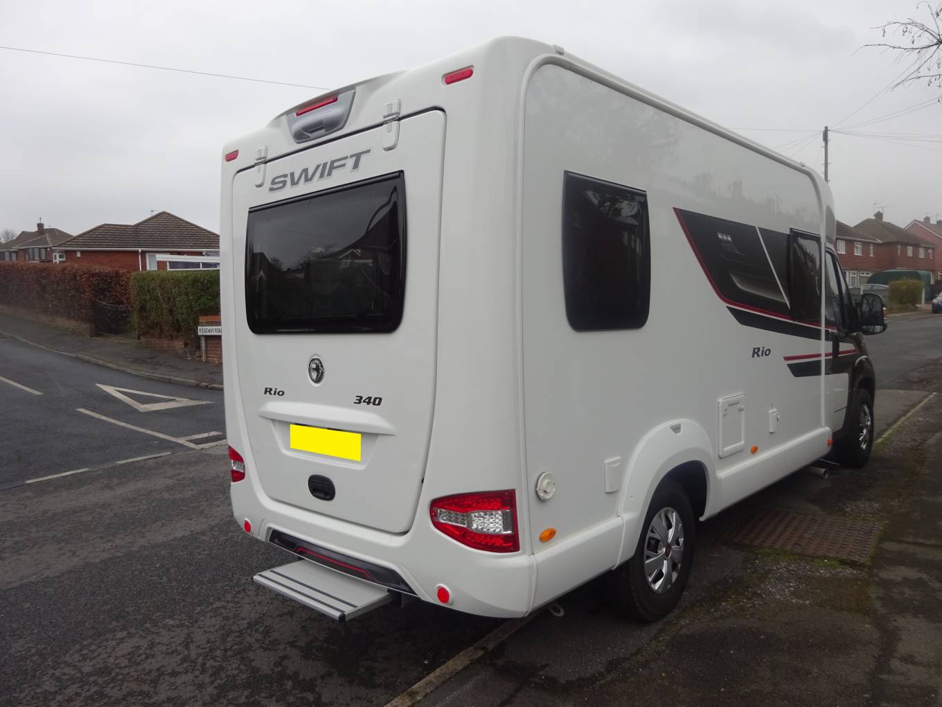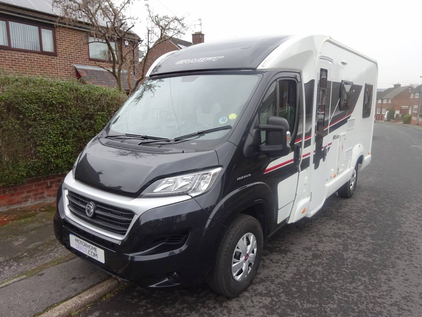 Motorhome Depot presents this 4 berth, 2.3 ltr, manual, diesel Swift Rio 340 Black Edition on a Fiat chassis. Firstly, we start at the rear lounge. This is the perfect place to relax during the day and benefits from a rear access door. When the night draws in the rear lounge converts into a comfortable double bed, with a further spacious drop down bed above. As we move forward through this well laid out Motorhome we come to the well equipped and large kitchen. The Kitchen includes a 3 way fridge, 3 ring gas burner, electric hot plate, microwave, oven, grill and wash basin. Opposite is the washroom. This consists of a toilet, shower and had wash basin. Next, is the front dinette which seats 4 comfortably. With a fixed bench for two with seat belts and 2 swivel seats. This Motorhome has been well maintained and is up to date with servicing and habitation checks. It also comes with extras such as a solar panel, outdoor BBQ point and cruise control. Please call Tom on 01144 055993 for more information and the extended picture file on this lovely Motorhome.