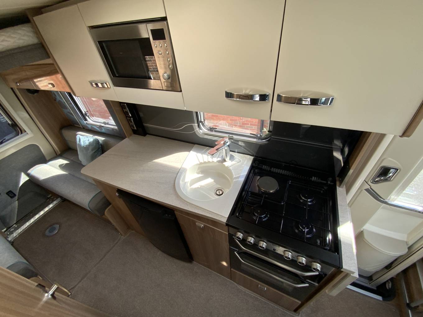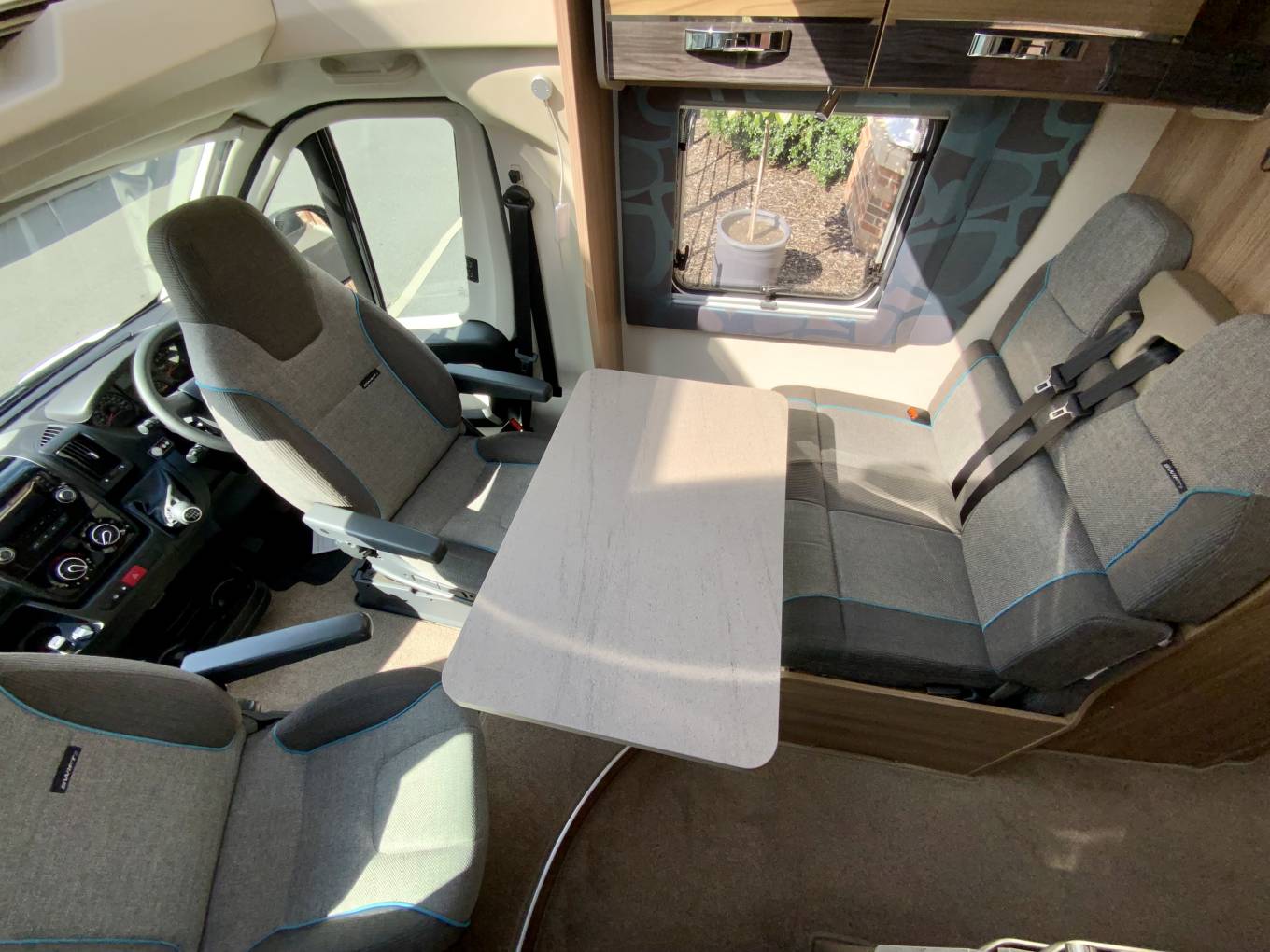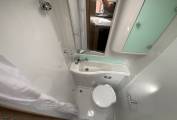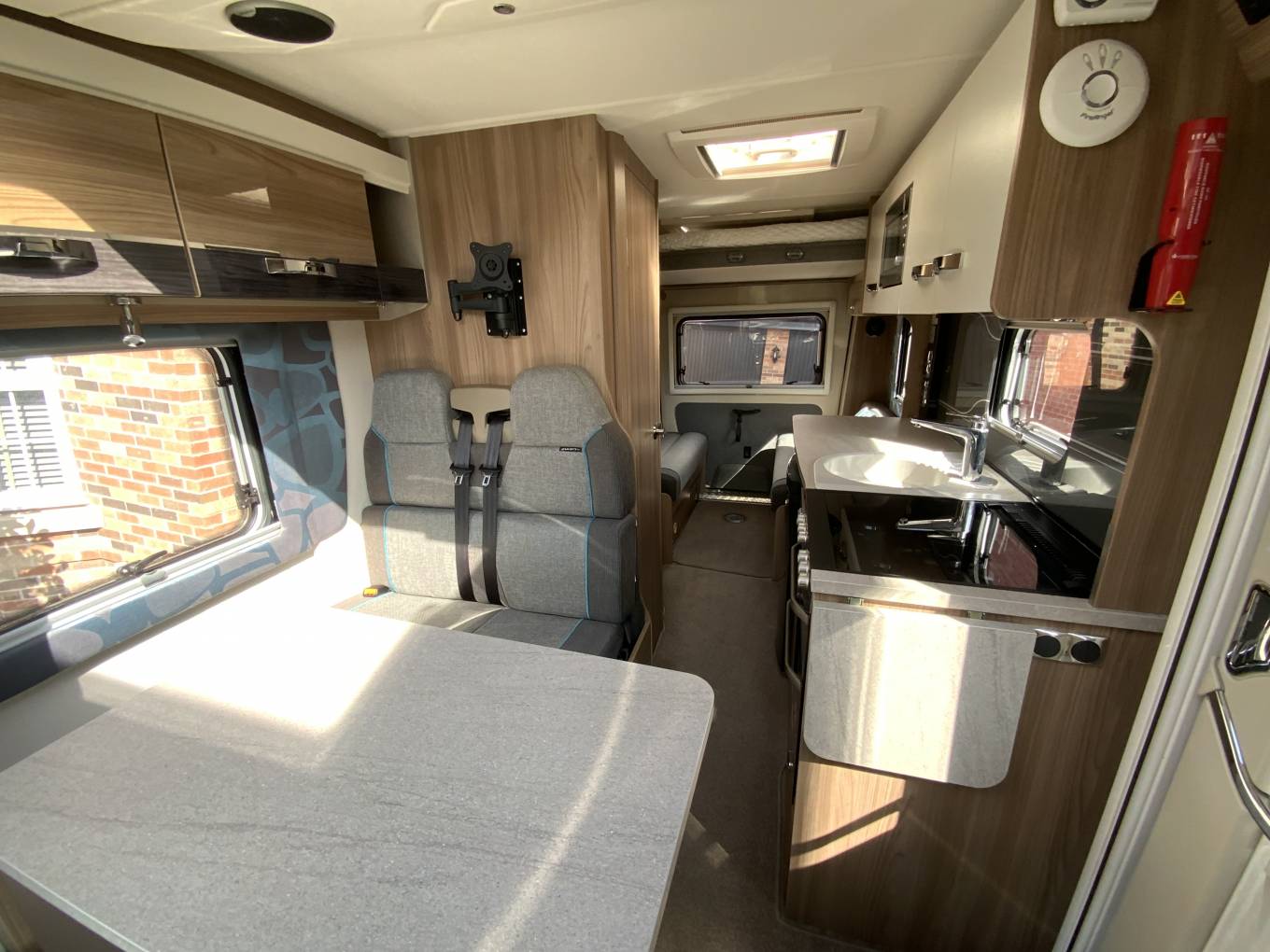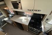 This fantastic four birth swift Rio 340 both sleeps and travels four people. There is a multi position mechanical drop-down bed above the rear lounge and a huge tailgate door making it a lovely open space to lounge or dine. Behind the cab are the two additional travelling seats that can become a dining area for four by utilising the two swivel front seats. The front table is removable and can be placed in the rear lounge area when required. The centre kitchen is a good size and very well equipped and has a worktop extension, full cooker with three gas hobs and a hot plate, oven and grill. There is also a fridge freezer, sink and microwave. The washroom is located opposite the kitchen and features a sink with a combined tap and shower and a cassette toilet, next to the washroom is a generous wardrobe for storage.