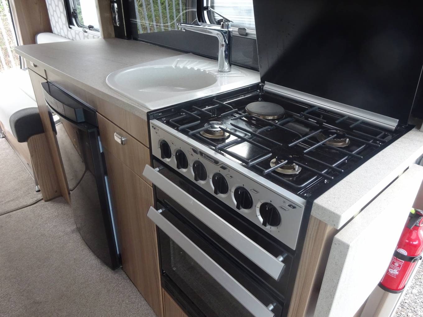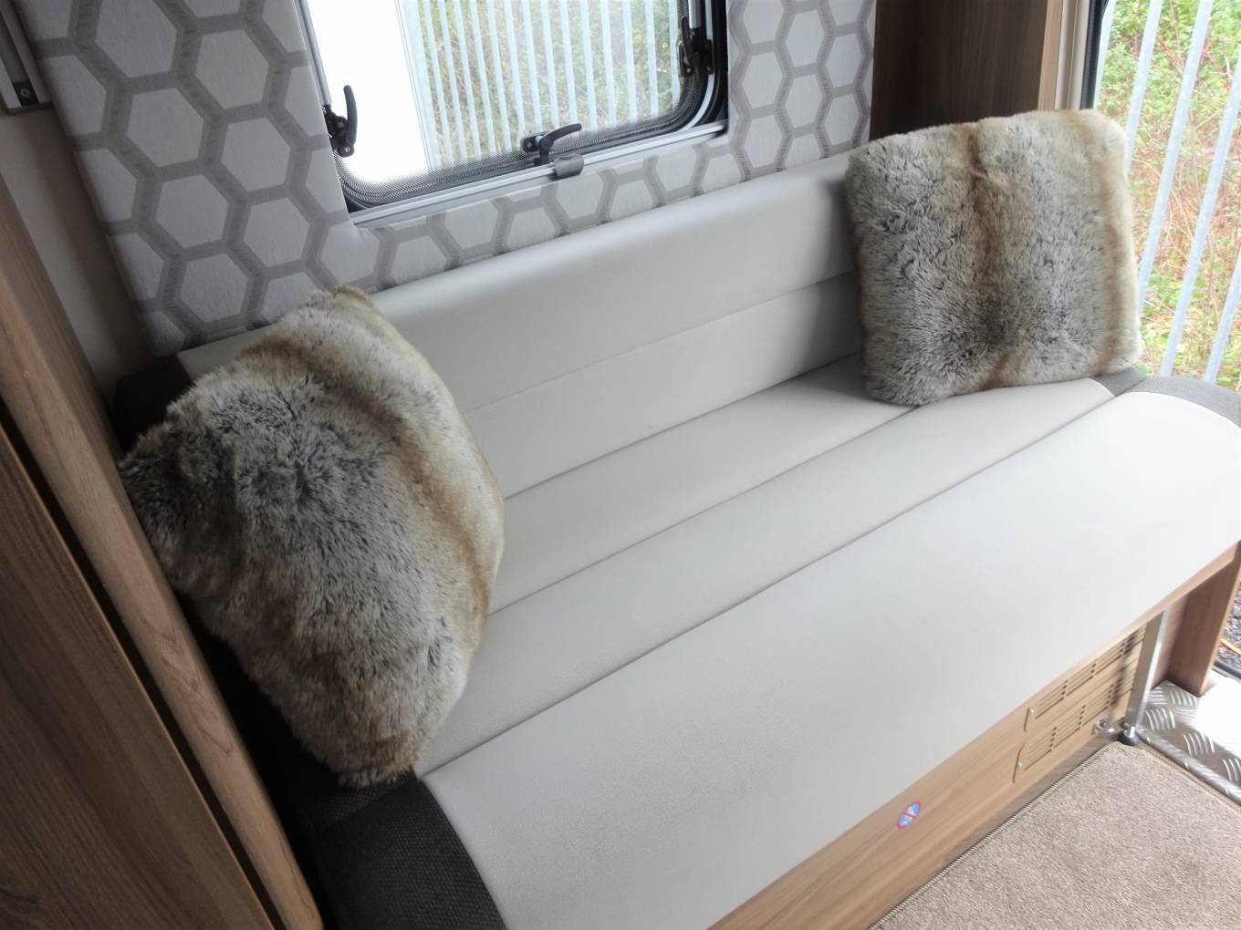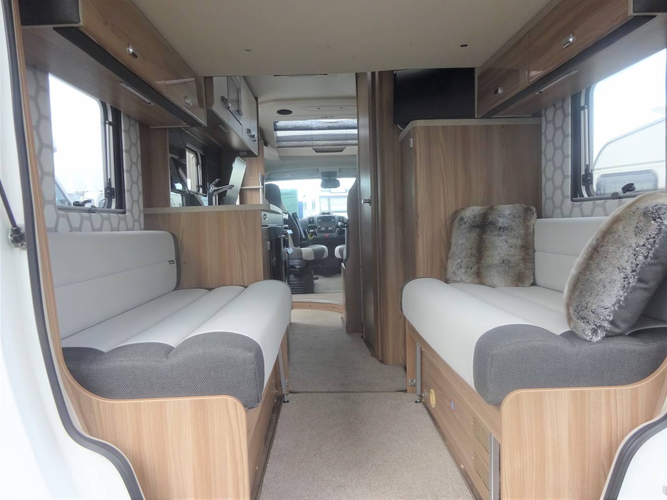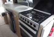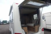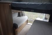 To the rear is a lounge with opposing sofas, which convert to a double bed. Above here, there is a manually operated drop down double. This enables the forward dinette to be as spacious as possible and with 2 swivel cab seats four can eat and relax in comfort. The lifting rear section makes an instant awning and opens the interior out completely.