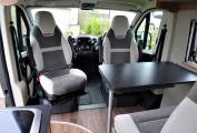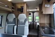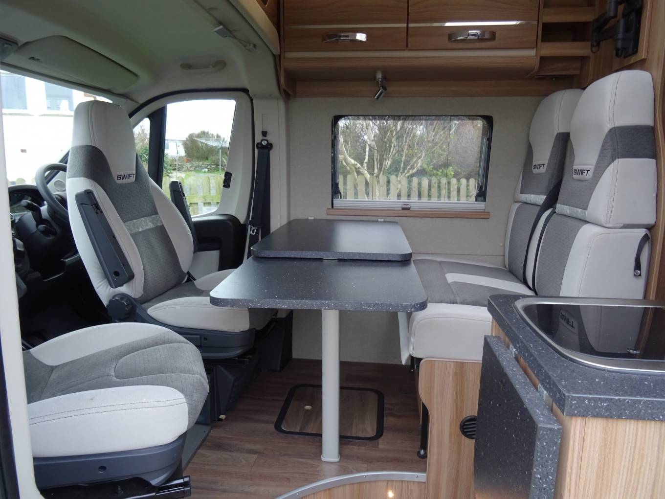 To the front of the vehicle you will find the two forward facing seats with two 3-point seatbelts and together with the extendable table and the two Captain seats provide an additional dining area which converts to a single bed if needed.