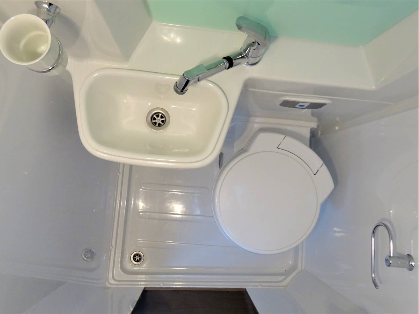 To the centre you will find the washroom which consists of a Thetford cassette toilet, hand washbasin and integrated shower.