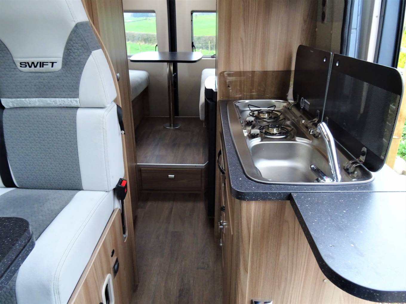 The kitchen is adjacent and provides a 2-ring gas hob, sink with hot and cold water, grill and 3-way fridge with small freezer compartment.