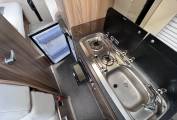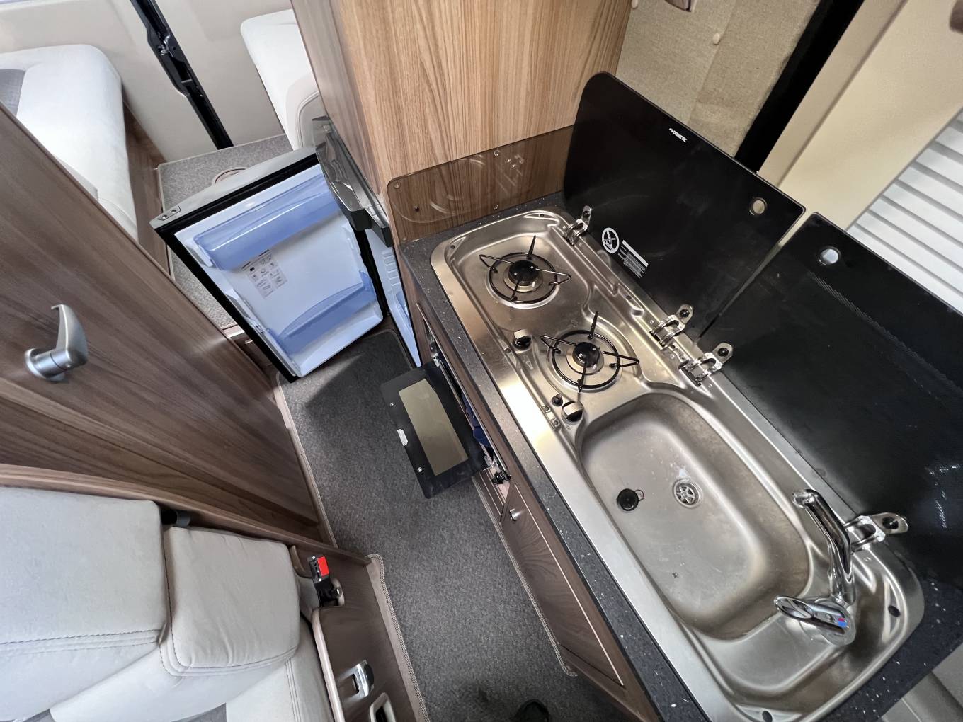 To the right of your entrance door is the side kitchen consisting of a Twin Burner Gas Hob, a Grill, a Sink with Hot & Cold water supply and a Three Energy Source Dometic Fridge.
