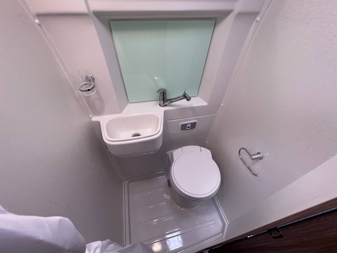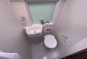 Opposite is the bathroom where you will find a Thetford flush cassette Toilet, a Wash Handbasin a Shower Unit and a Mirrored Vanity cupboard.