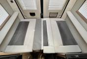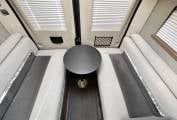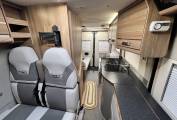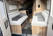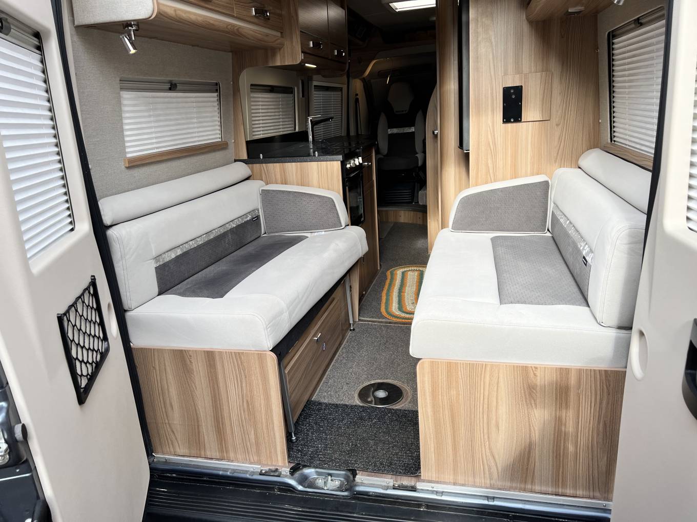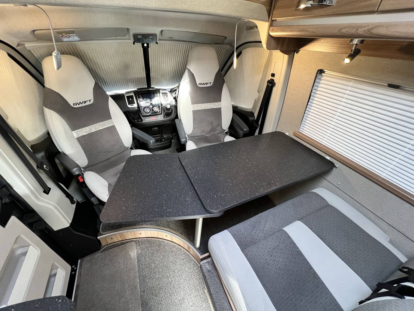 On entering via the large side sliding door in front of you is front lounge and dining area consisting of twin swivelling cab seats, twin forward facing belted rear seats, an extendable table and cupboards above.