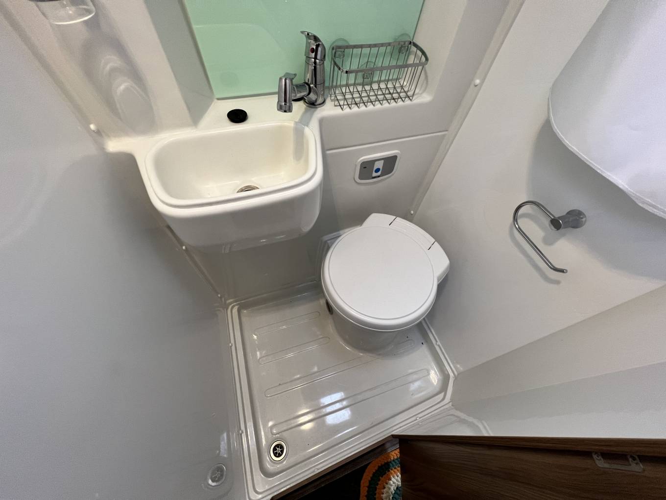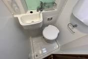 Behind the rear travel seats is the wetroom style bathroom where you will find a Thetford Electric Flush Cassette Toilet, a Wash Handbasin and a Shower.