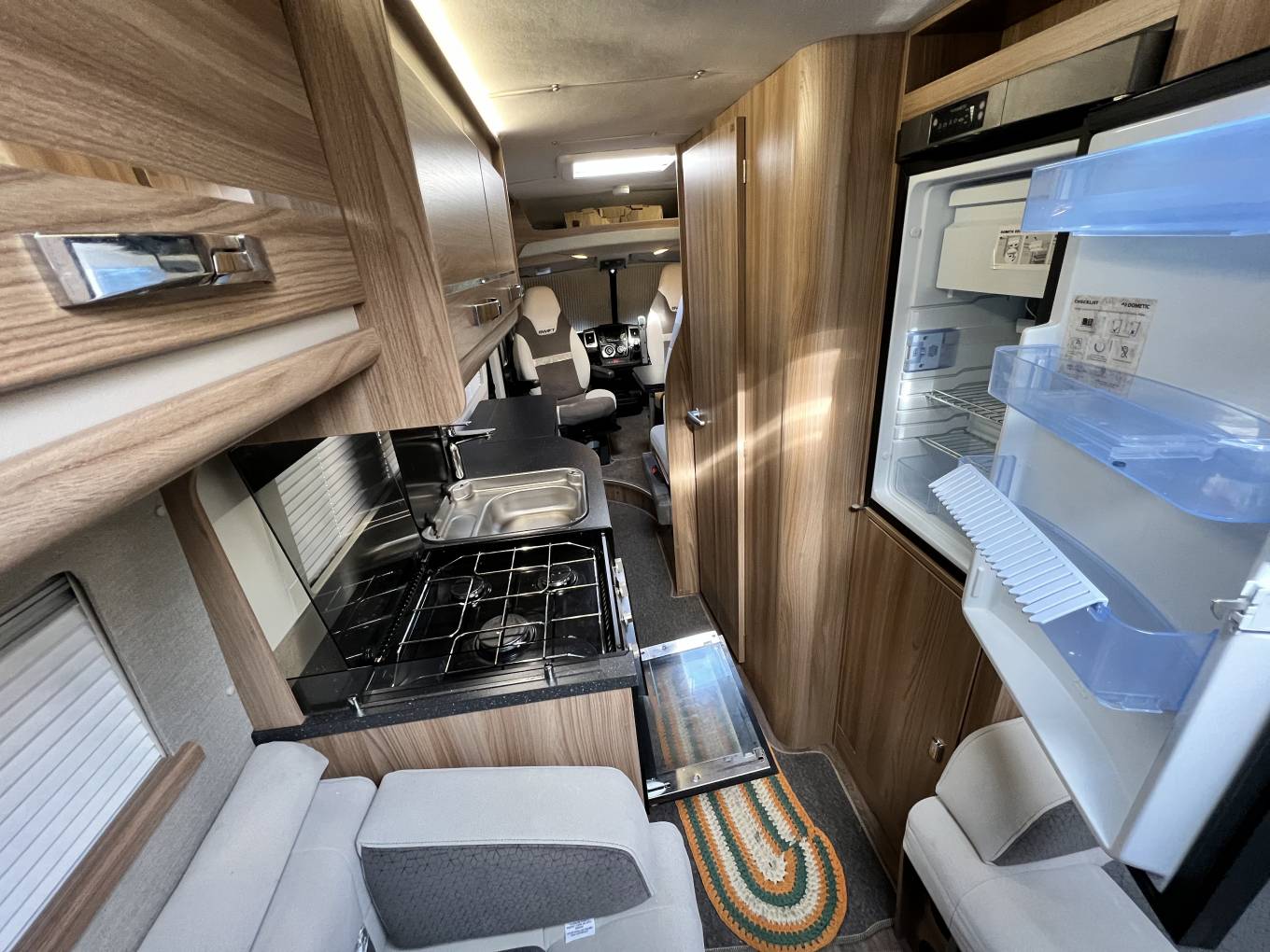 On the opposite side is a Three Energy Source Dometic Fridge with the wardrobe below.
