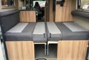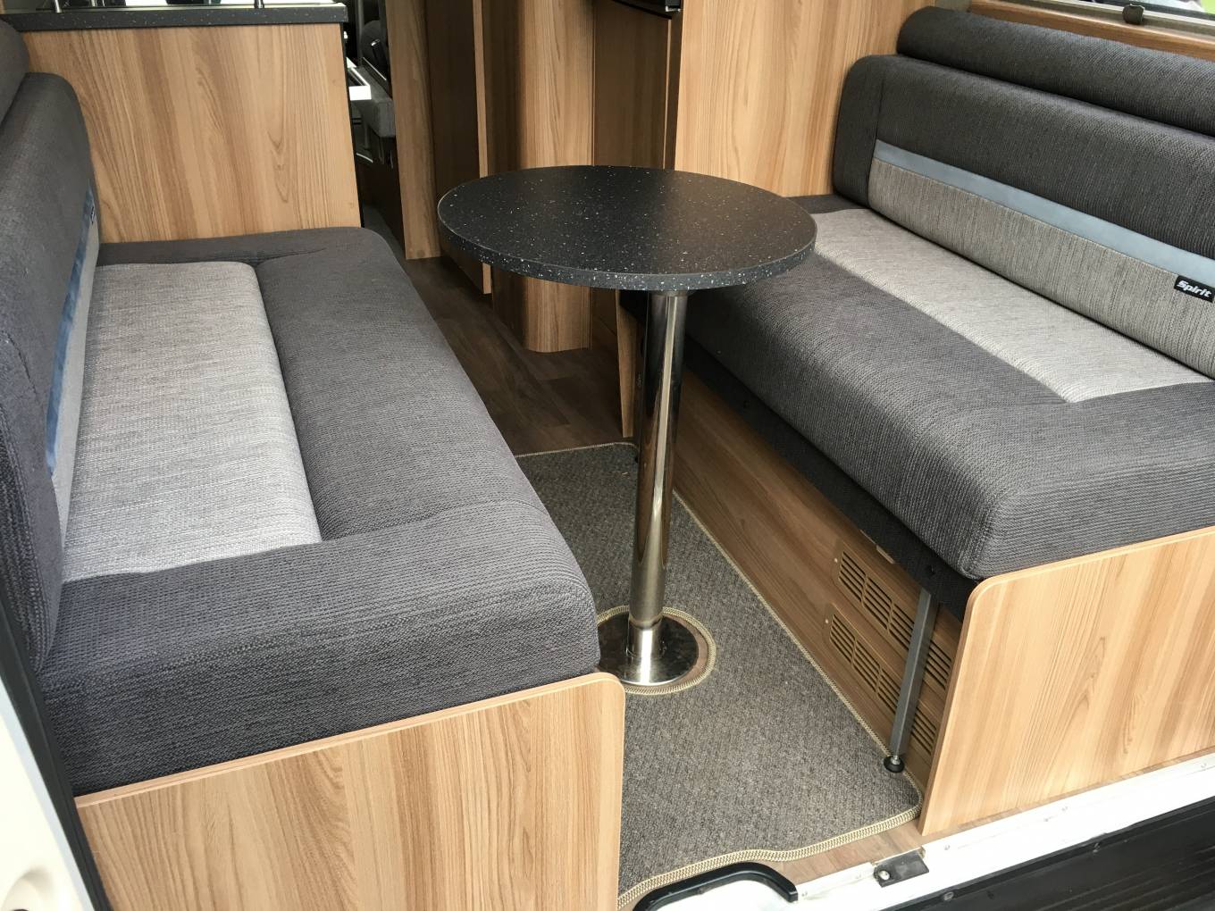 rear lounge with parallel sofa layout, offering a large double bed at night