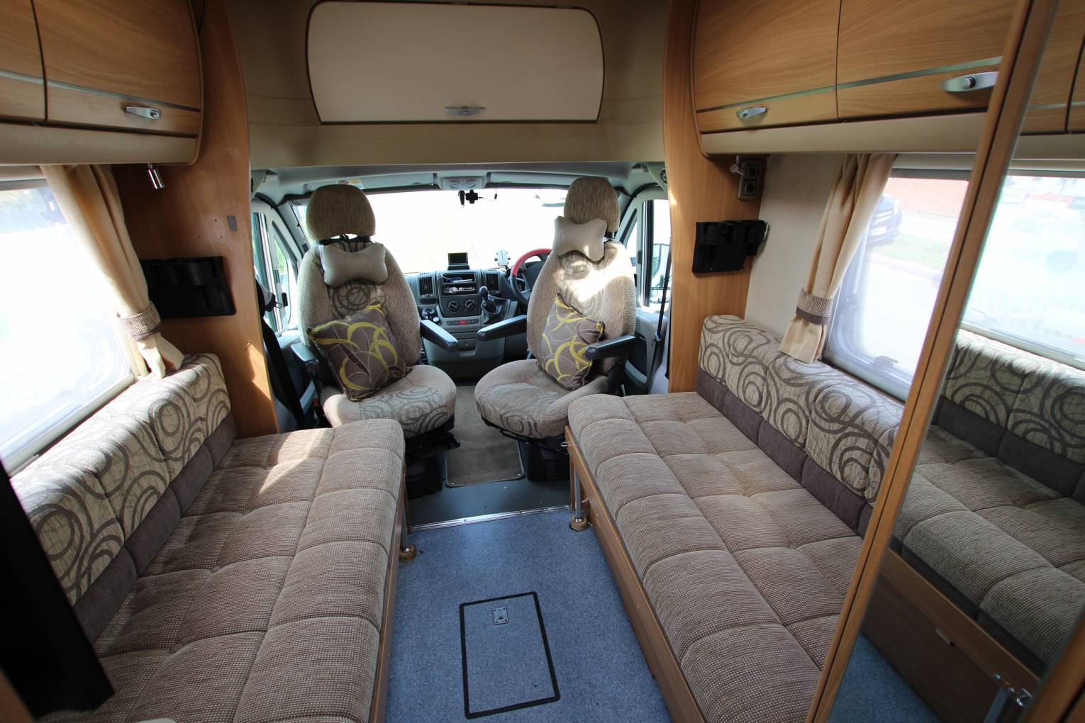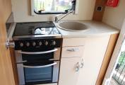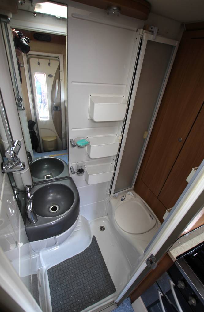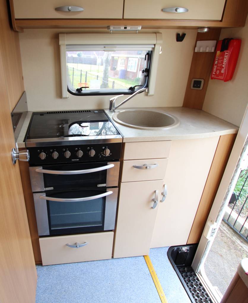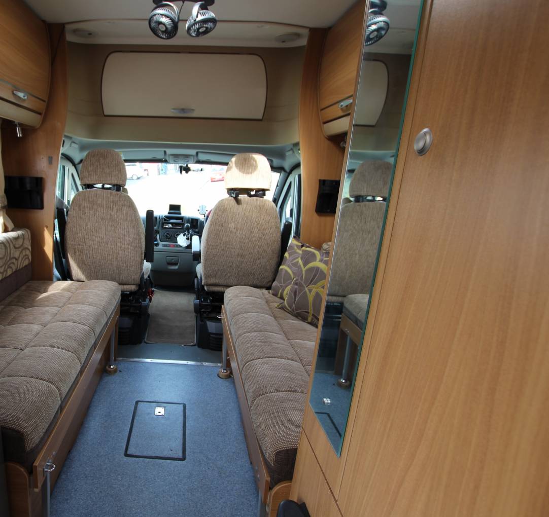 The spec consists of hot water, 3 way heating, 3 way fridge with freezer box, cooker with gas hob, freshSp and waste water tanks. The 2 bench seats can be made up into a very comfortable sized double bed. Also with an ingenious fill in pillow placed on the captain’s chairs you can turn the benches into two single beds.