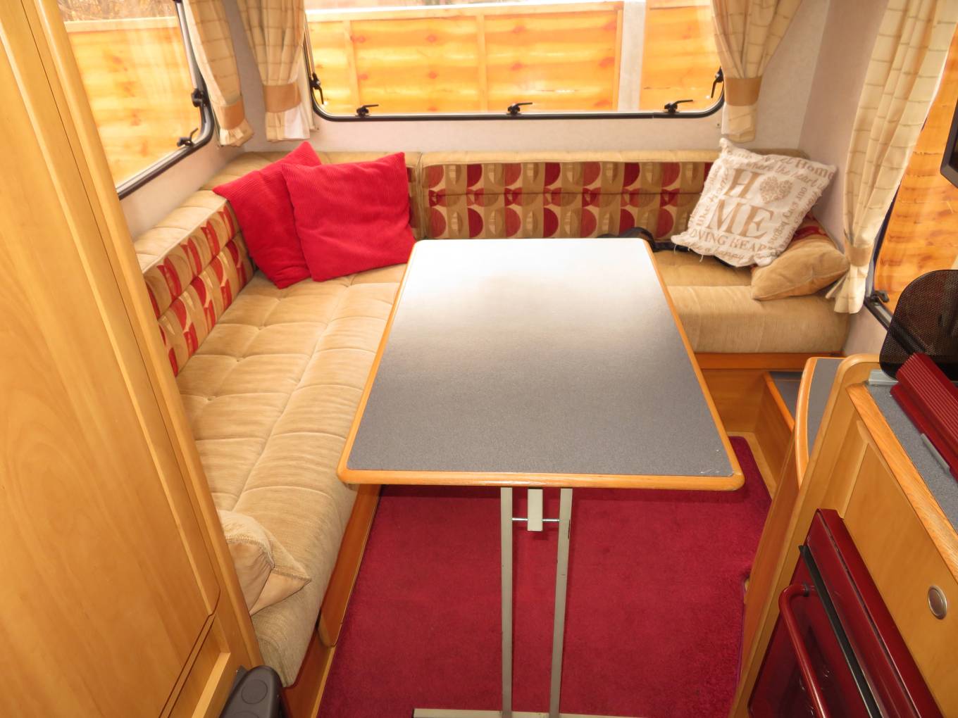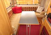 The habitation area of this motorhome is a real delight. It is bright, clean and benefits from a wonderful L shaped lounge at the rear, which is the perfect place to put your feet up and relax. There is a cleverly stored folding table that can be put up in the centre of the lounge area to great an ideal place to enjoy a meal or snack.