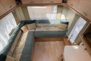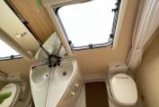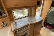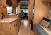 To the rear you have your L shaped lounge with a bright and spacious feel making it a lovely place to sit, relax and eat. The dining table is free standing which means it is suitable for dining outside as well as inside. Moving into your kitchen area you have a full oven with grill and hob, a sink with mixer tap, a 3 way fridge freezer and great storage space. Adjacent to this you have your washroom which comes equip with a toilet cassette, sink with pull out shower head tap and more great storage space.