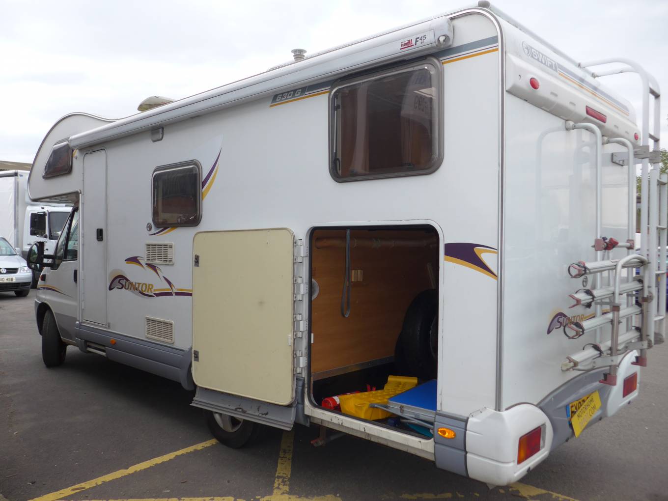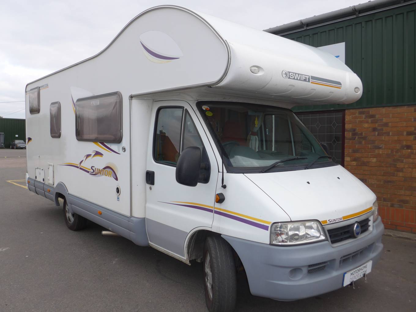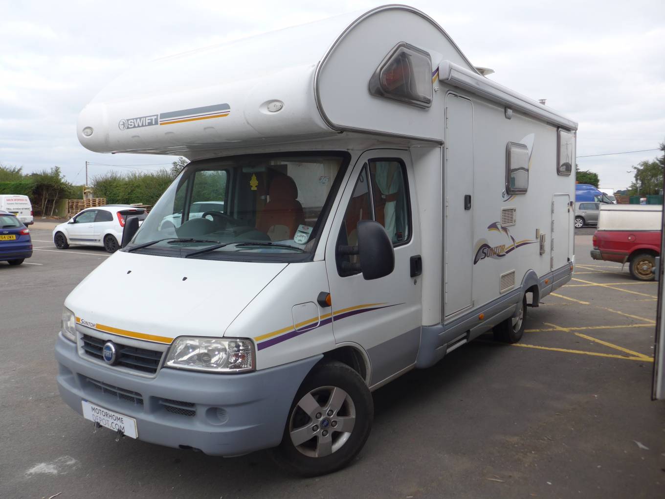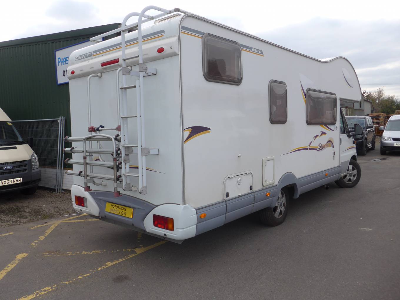 2007 Swift Sundance 630 G. 6 Berth Coach built Motorhome with Fixed Rear Bed, Large Garage, Overcab Bed, Centre Dinette. Washroom with Shower Thethford Cassette Toilet and washbasin. Features Refillable Gas system, 4 Bike Rack, Roof ladder and Roof Rails, Alloys Wheels, electric Step.