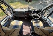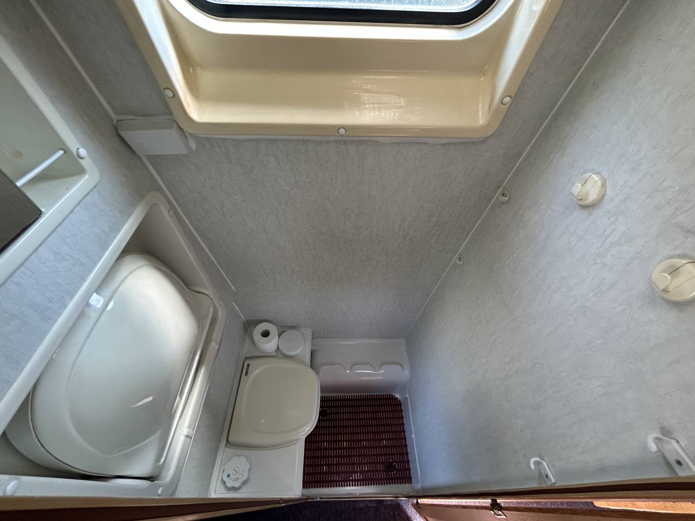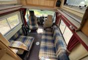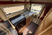 At the front of the vehicle we have a seating area with a bench seat opposite the sliding door and a single seat beside the sliding door with additional three point seatbelt. The seating area can seat up to 5 comfortably by utilising the swivel passenger seat and creates a comfortable double bed for sleeping. Moving to the rear of the vehicle we have a kitchen area on one side with a good size fridge, sink with drainer and full cooker with hob and combination oven and grill. Opposite the kitchen area we have the washroom with cassette toilet, fold down handbasin and full shower.