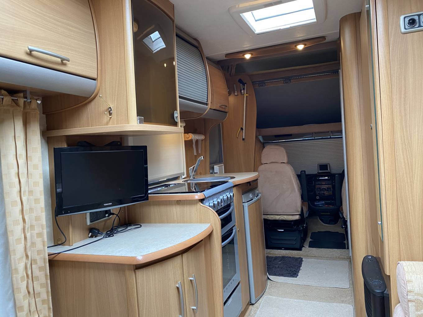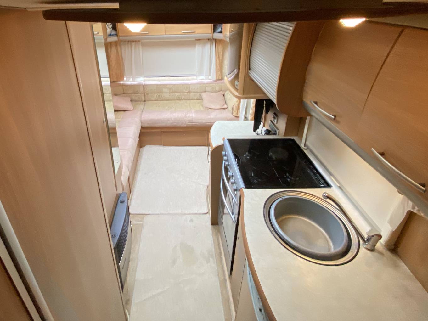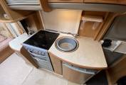 Opposite and to the right of the entrance door is the extensively equipped kitchen where you will find a three gas burner and one electric hob, a separate grill and oven, a three energy source Dometic Fridge, a Microwave Oven, a sink with hot and cold water and a drainer plus plenty of storage space.