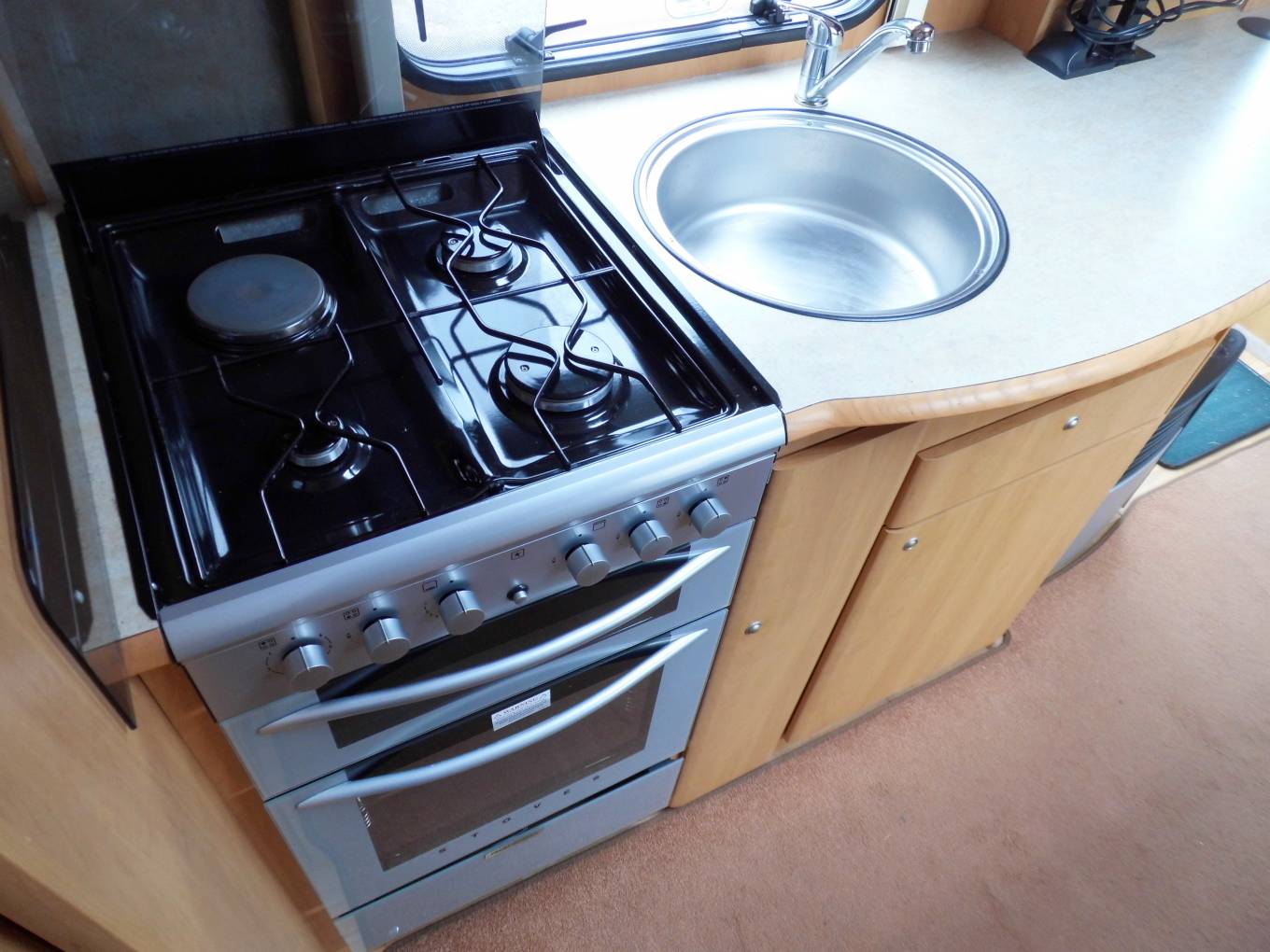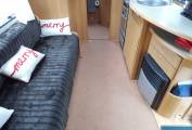 Moving forwards, the kitchen which is located centrally has an oven and grill, dual fuel hob with 3 gas burners and 1 electric hotplate, a 3 way Dometic fridge freezer, a sink with a mixer tap and a really generous work top area to prepare your food. There is plenty of cupboard and drawer space as well as additional room in the overhead lockers.