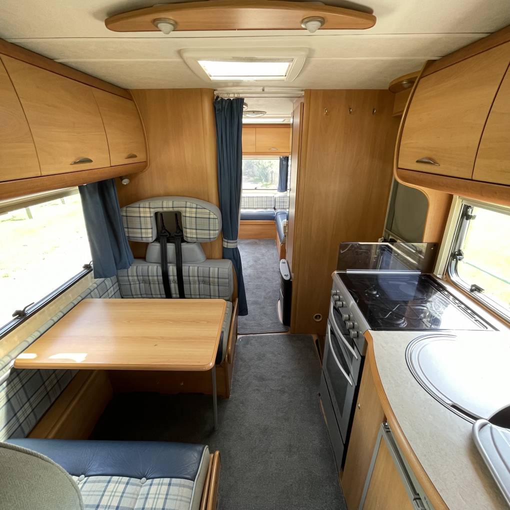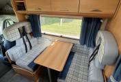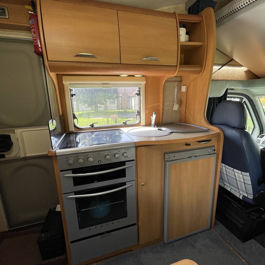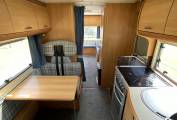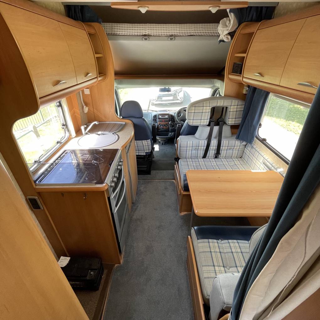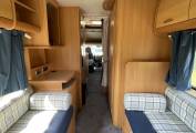 To the rear you have the popular U shaped lounge which comes with a fold away free standing table and lots of overhead storage space. This area also caters for 2 of the 6 berths with a large double bed. Moving forwards into your central washroom you have a shower, sink, electric flush toilet, cabinet and mirror. In your second living area you have both a 4 seater dinette area which comes complete with 4 additional 3 point seatbelts and a removable table as well as your kitchen area which includes a full oven with hob and grill, 3 way fridge, sink and yet more storage space. Finally the last of the 6 berths are catered for in the over cab bed area which is accessible via the luton ladder.