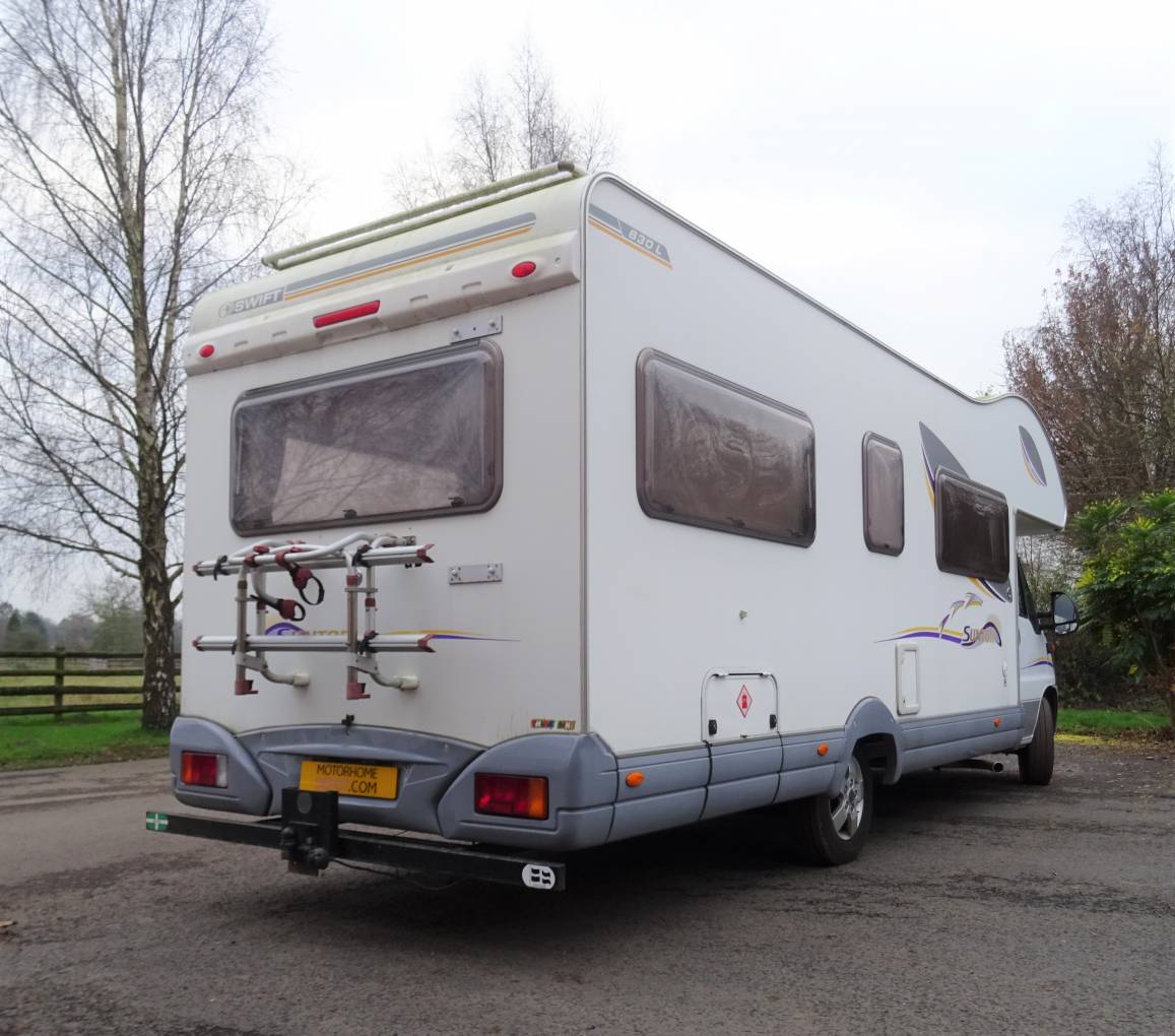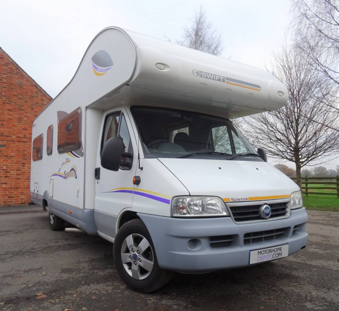 Swift Suntor 630L. 2005, 17,300 miles 6 berth, 6 belts on a Fiat Ducato. 2.8 JTD, 5 speed manual gear box. New refurbished interior, part leather, includes new carpets and curtains. Electric cab windows and electric front side mirrors, central locking plus CD radio with removable facia. Full original documentation pack including manuals and full-service history, only 17,000 genuine miles. Accommodation includes, lift over cab king size bed, pull out dinette bed plus rear popular u-shaped bed, creating large king/super king-sized bed, under a large skylight. Kitchenette includes 1 electric, 3 burner gas hob, grill, and oven. Plus, integrated stainless steel sink, domestic fridge freezer and a good prep area. Shower room includes wash basin and Thetford cassette toilet. Loads of internal storage and a Truma heater. Fly nets on all the windows and habitation door. Externally, motor home includes stylish alloy wheels, large wind out awning with additional Fiamma enclosed awning. Fiamma x2 bike bicycle rack, reversing camera and tow bar. M.O.T till August 2020.