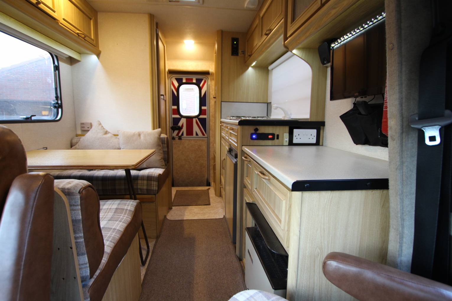 There is ample locker and cupboard space in the motor home, the centre dinette area converts to a double berth by lowering the table and inserting the bed infill pieces, the 2 other berths in the over cab accessed via the luton ladder.
