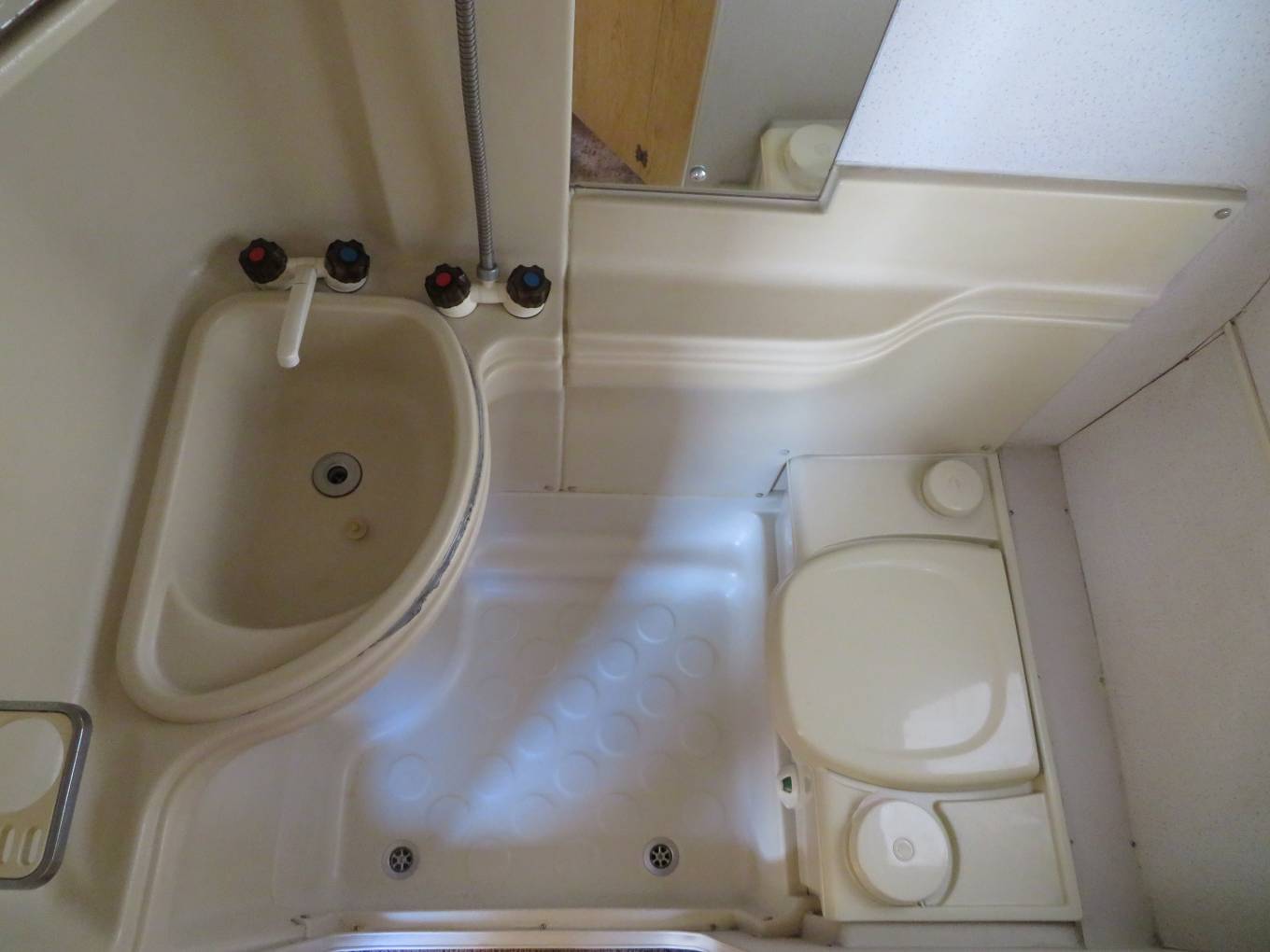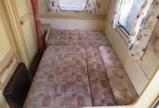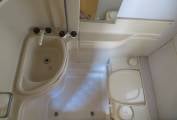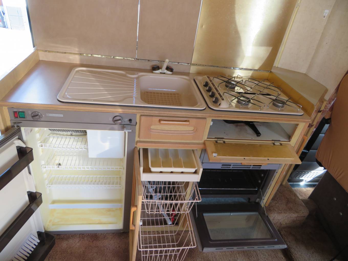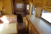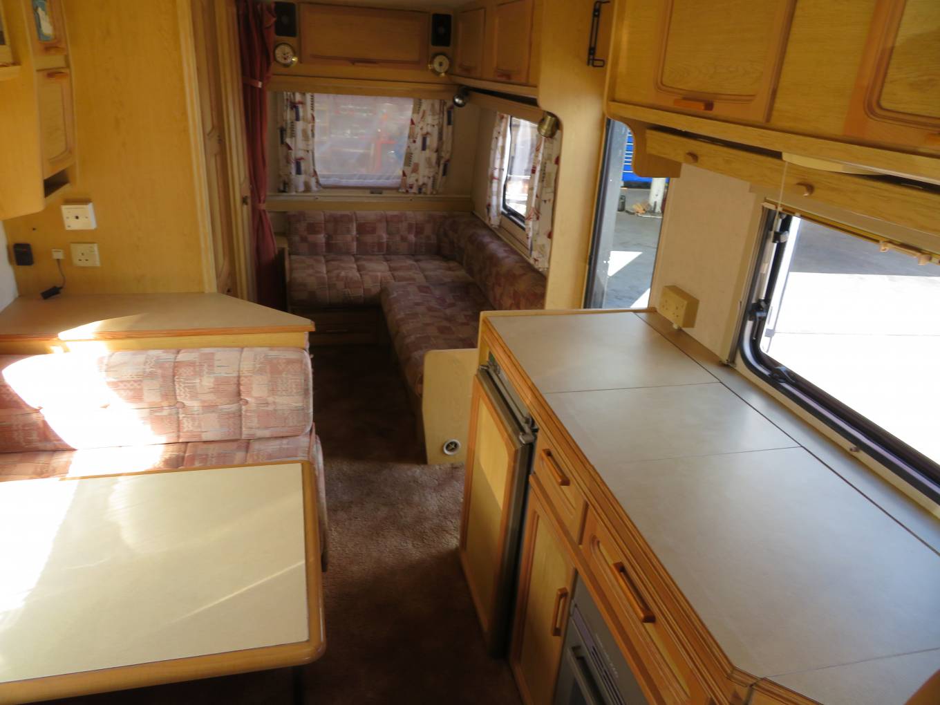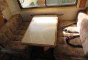 The kitchen is well equipped with a separate oven, grill and 3 burner hob, all run off gas. There is a 3 way fridge with small freezer compartment. a large sink with side drainer. All of these are concealed under folding worktops, there is a pull out draw with two pull out baskets below. The wash room has a toilet, sink and shower, with a vanity unit and mirrored cupboards above.