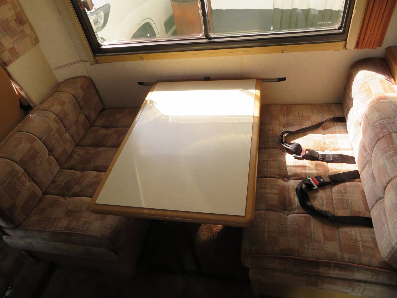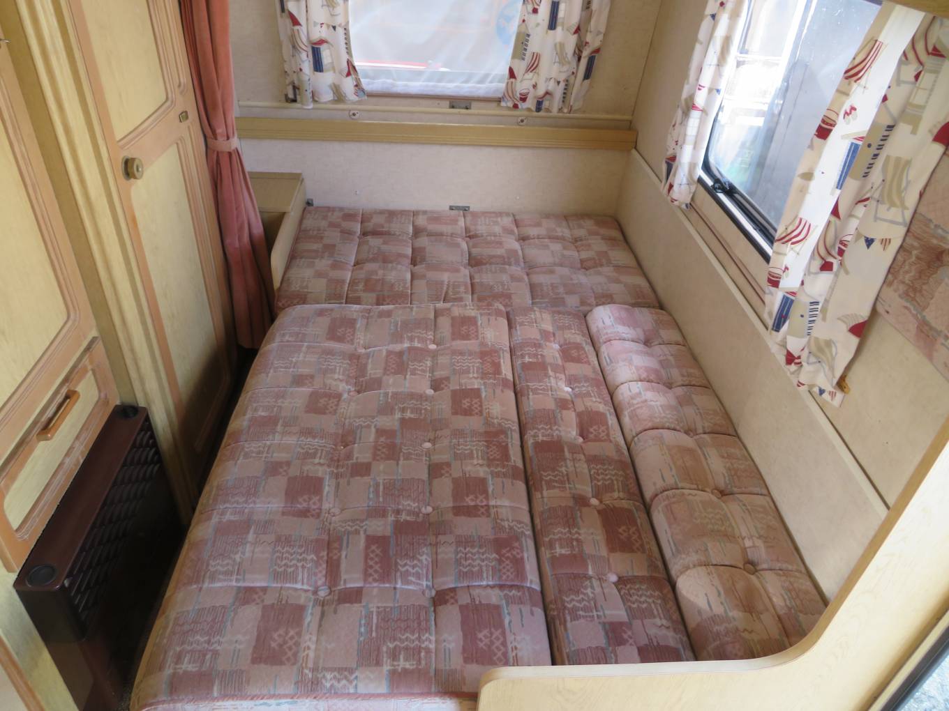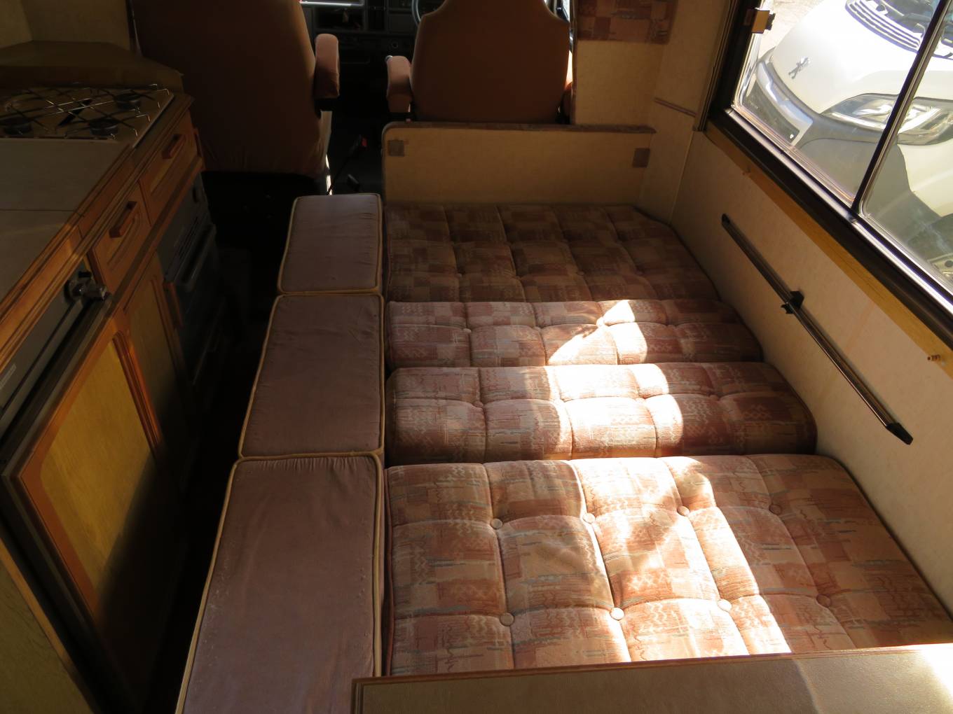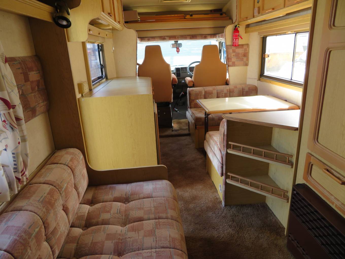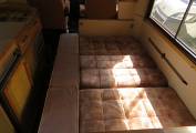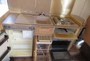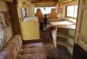 This van is perfect for a first time motorhome, it is a 6 berth, with 4 travelling seats, over cab double bed, center dinette converts into a large double and the rear L shaped lounge converts into a large double with a privacy curtain. There is lots of storage cupboards to the top and a large wardrobe with hanging rail.