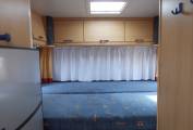 Opposite the washroom is the kitchen featuring a 3 gas burner hob, a microwave, a large 3 way fridge freezer, a sink with mixer tap and lots of cupboard storage space for your pots and pans and ingredients. There is also a portable oven and grill which neatly stores away in a cupboard when not in use.