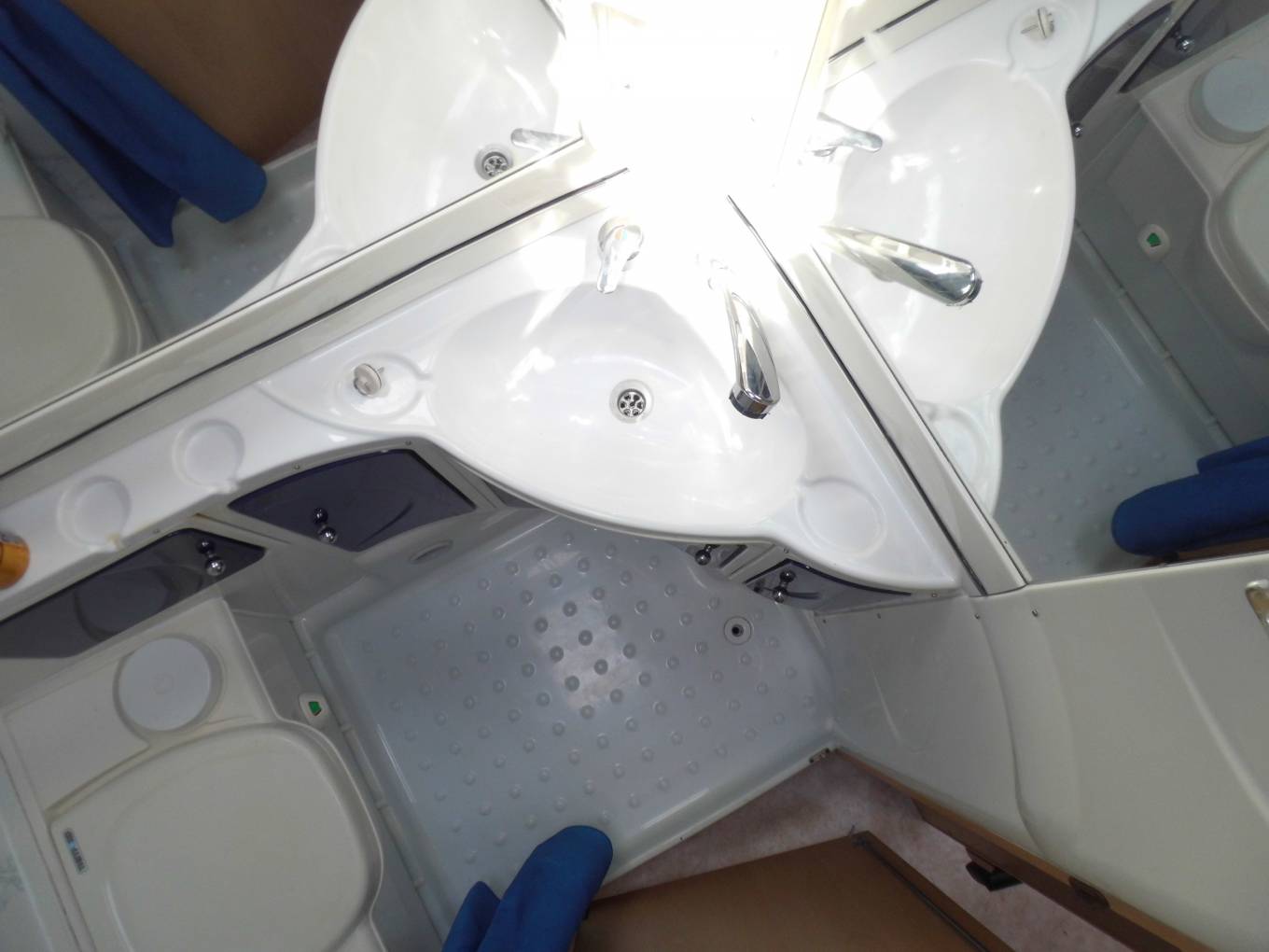 The internal layout comprises of a huge overcab bed measuring approximately 7'0 x 4'8", a fixed rear bed that's approximately 6'8" x 4'2" and the centrally located dinette makes into a third double bed. The fixed rear bed is a transverse bed with steps leading up to it so there's no need to climb up and down a ladder each night. As you exit the bedroom the washroom is on your left which has a shower which is built in to the tap head, a cassette toilet, a wash basin, a large mirror, plenty of bathroom cupboard space and a skylight to give you plenty of natural daylight.