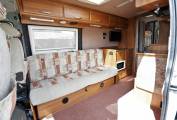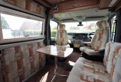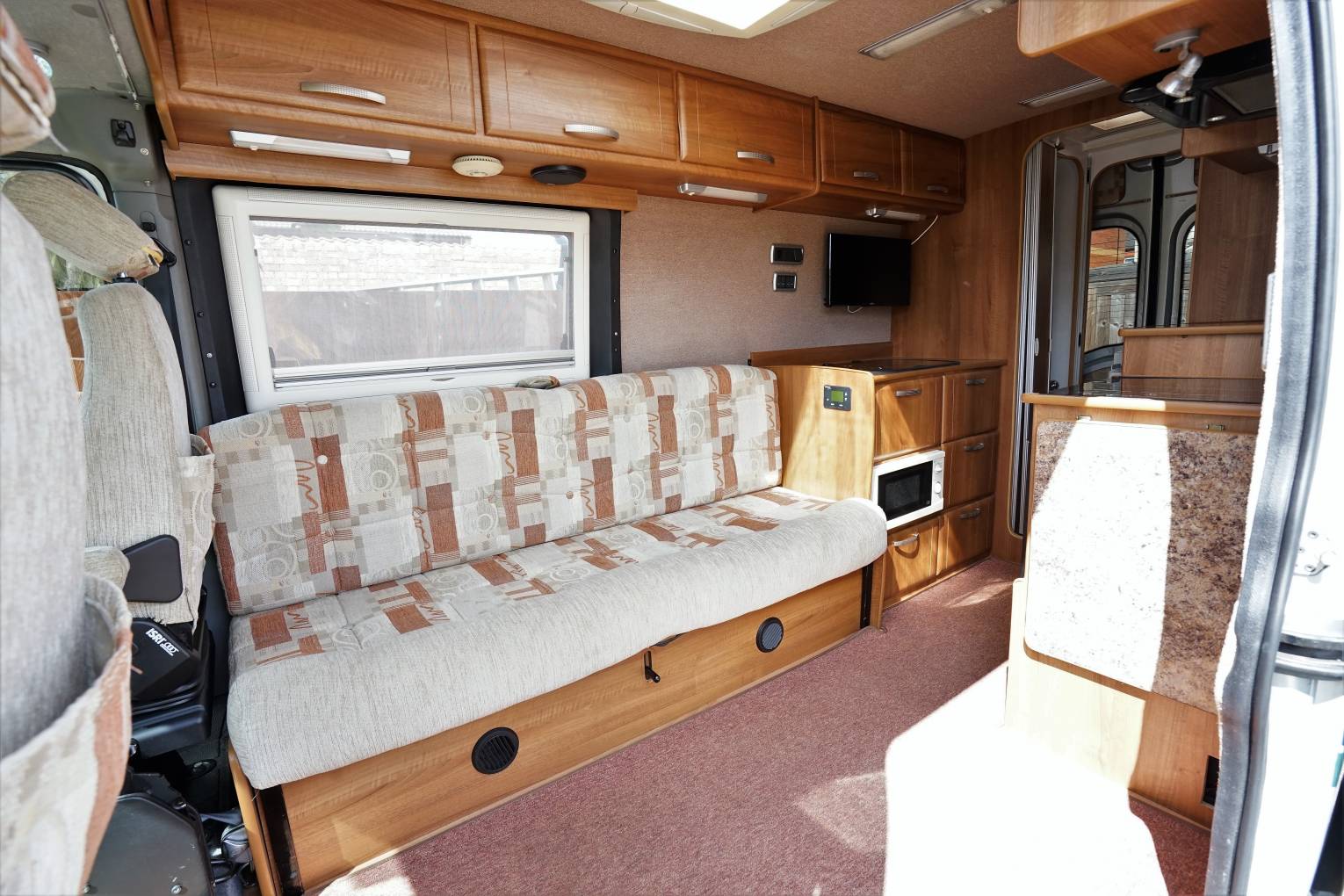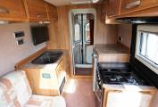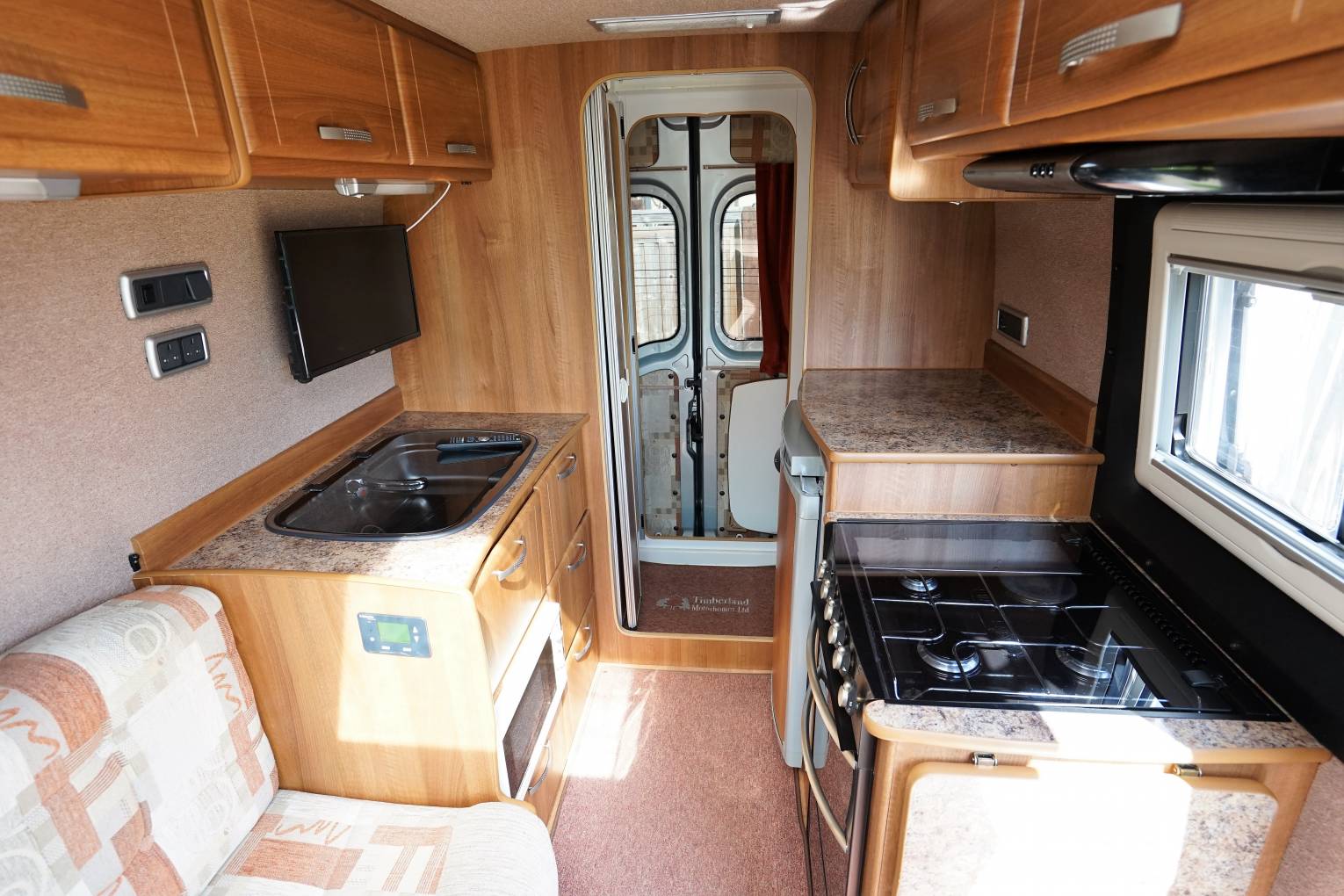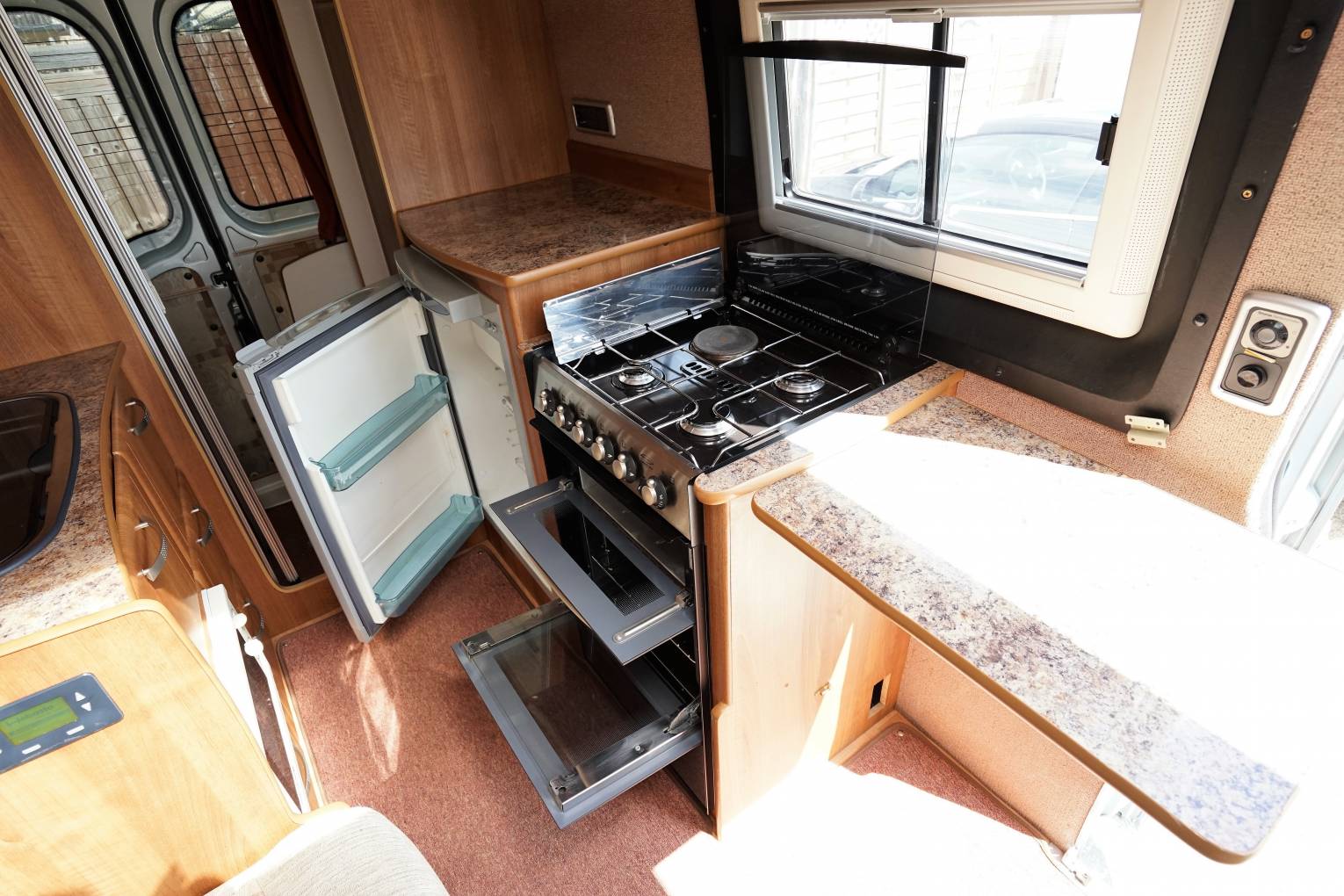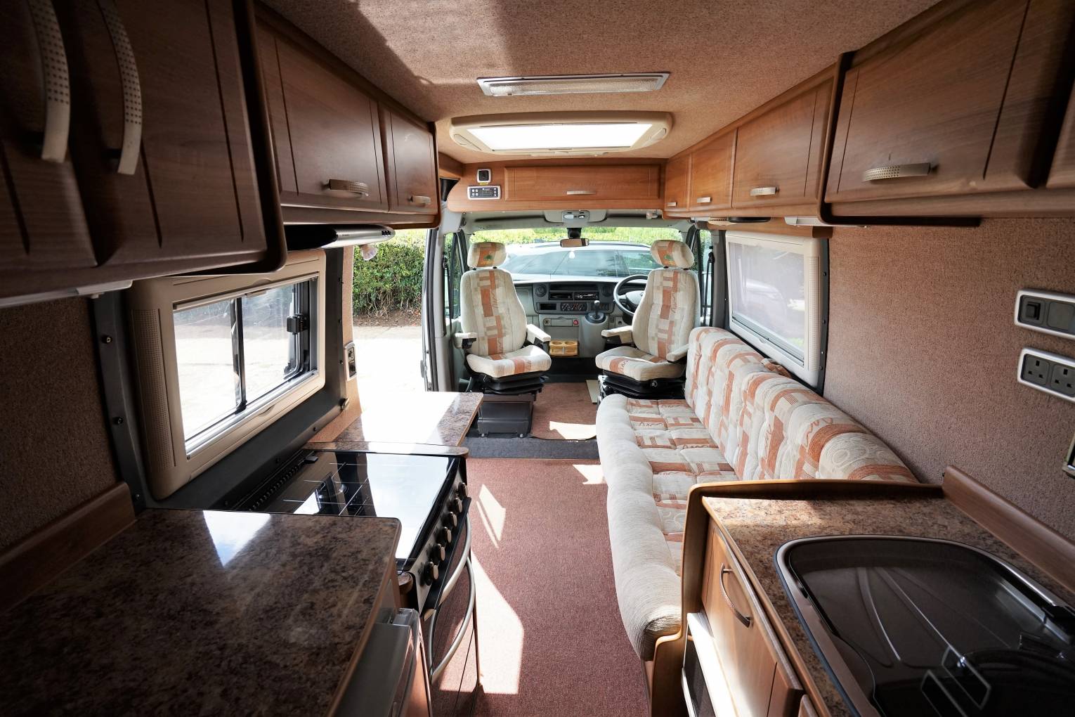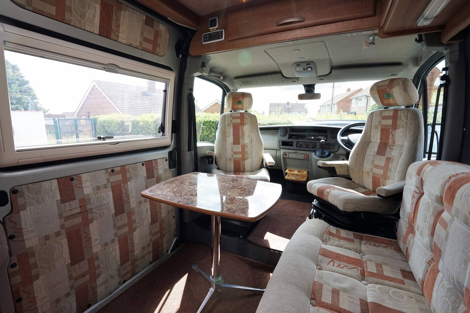 This is a spacious 2 berth motorhome with a large sliding side door to a front lounge with Swivel Captains seats, electric step, Large electric skylight, and a TV/DVD. It features a large side sofa which easily converts into a double bed. There is a freestanding table which can used both inside and outside of the van and fold up additional workspace next to the cooker.