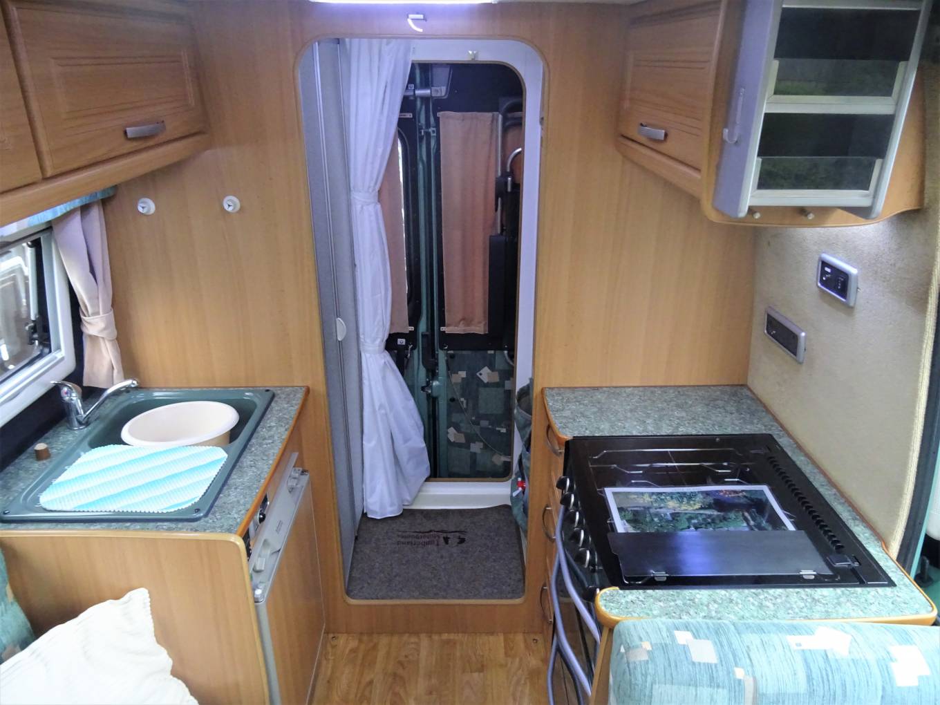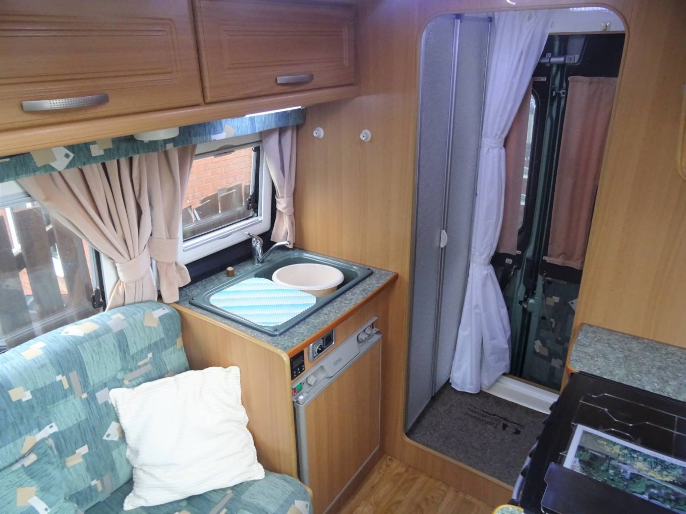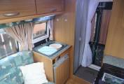 As we move forward we come to the kitchen area where there is a Dometic fridge with freezer compartment, sink with mixer tap, a good sized work top area and large Caprice 2040 oven with grille and 4 way gas hob.