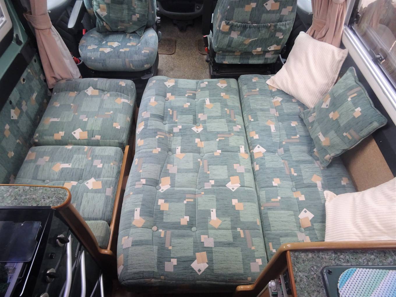 The dinette is incredibly spacious and is flooded with light making it a fabulous spot to relax and unwind in. There is a forward facing single travel seat along with a side facing 2 seater sofa with the dining table positioned in between making it the perfect place for a family meal. These seats both slide out to make the large double bed. There is also storage underneath the 2 seater sofa.