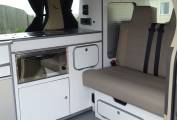 On entering the vehicle, you will find the central kitchen area, containing 2 burner hob, sink, grill and sink. There is a double seat with travelling seats which easily converts into a double bed at night. There is LED lighting adding that special touch. The vehicle also has plenty of storage space.