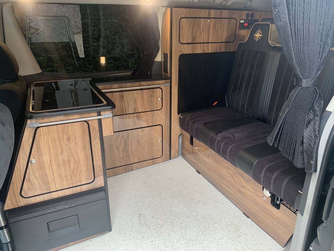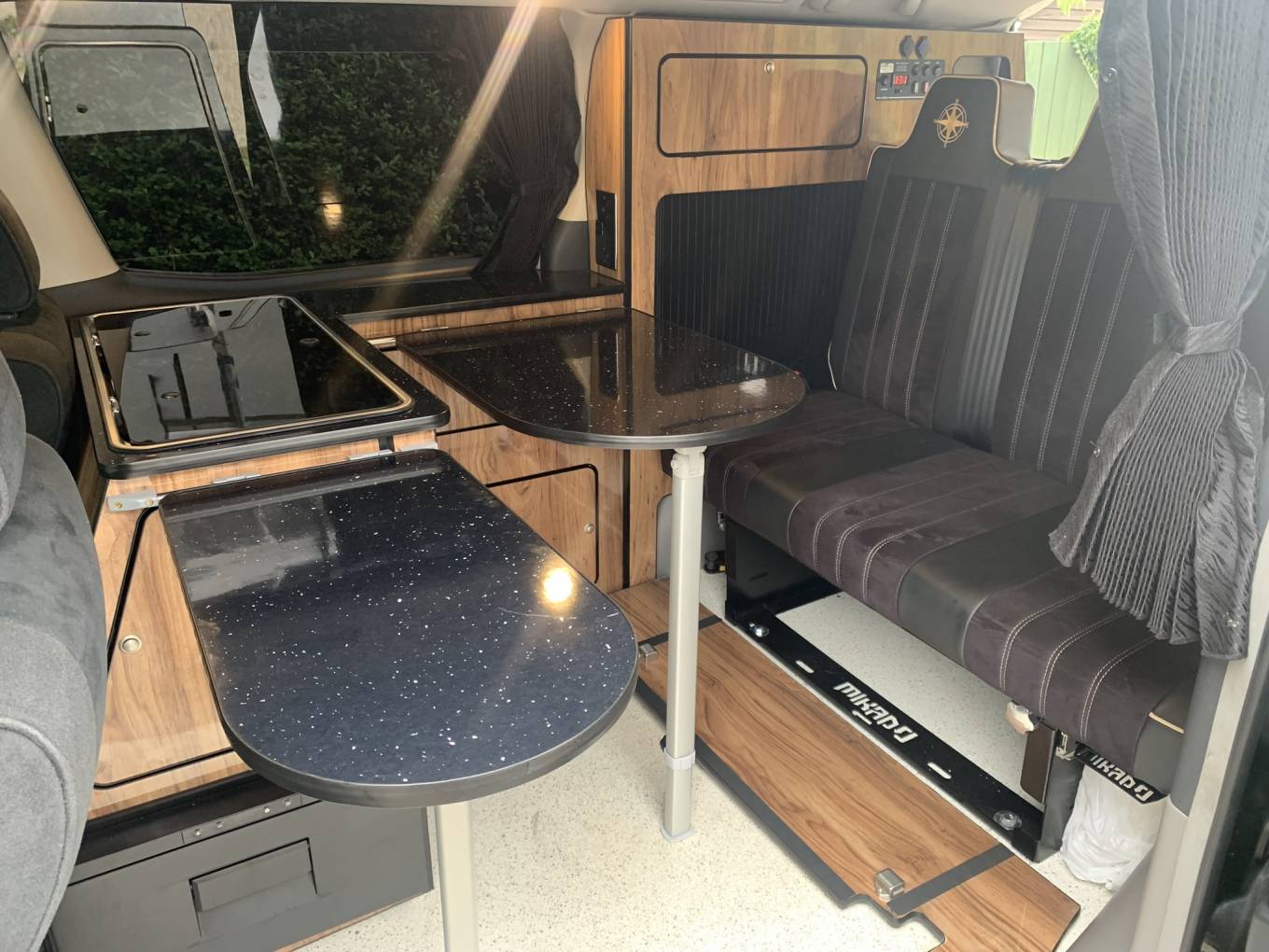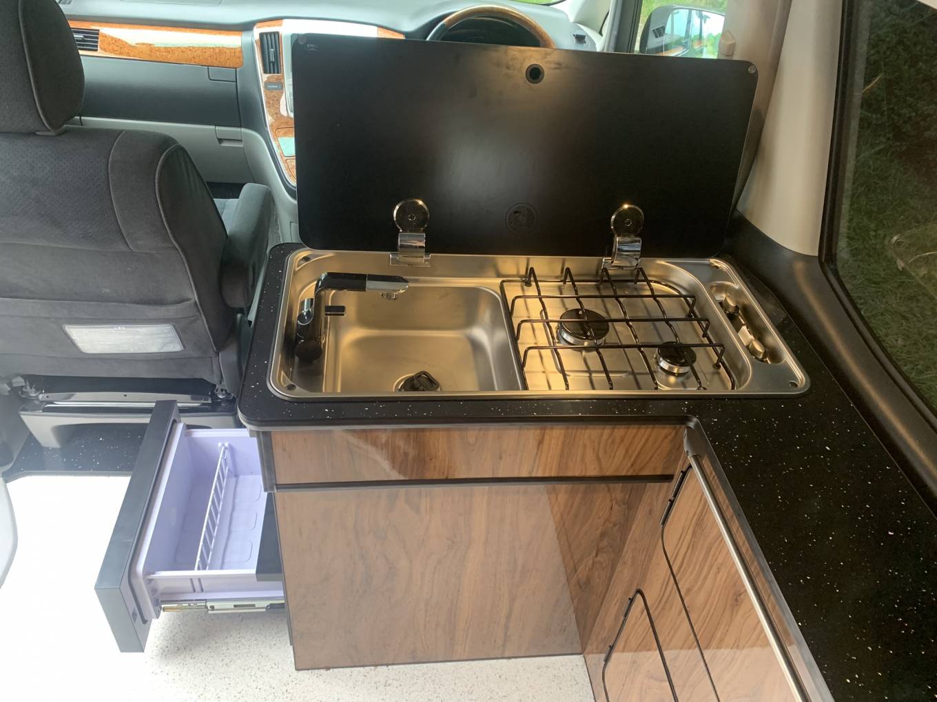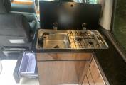 The centre dinette includes a 2 ring gas hob supplied by the gas bottle located underneath which can be accessed from the drivers side electric sliding rear door.. There is also a sink and a slide out fridge. In this area, there are 2 tables which is well positioned between all 5 travelling seats.
