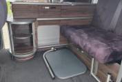 and stay in style. Straight ahead is the kitchen area with sink and tap and a hob with 2 gas burners, in-counter fridge and storage cupboard beside. The dining table is easily