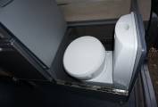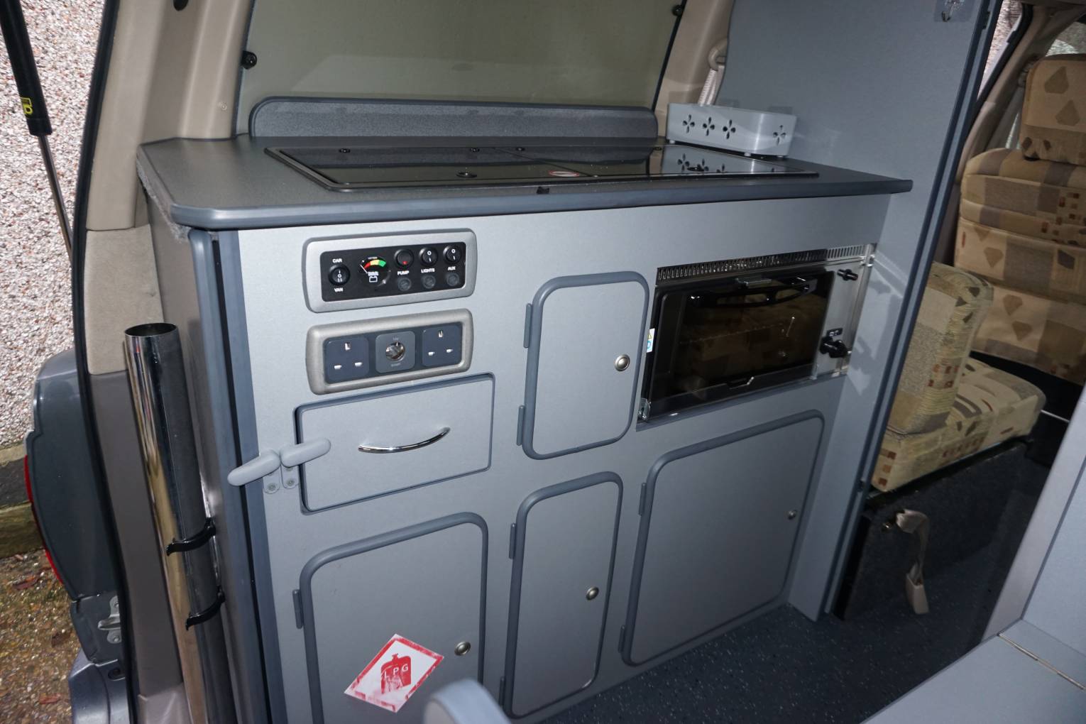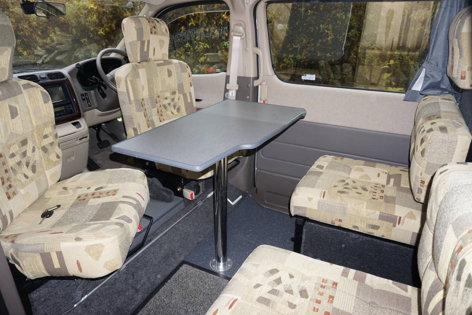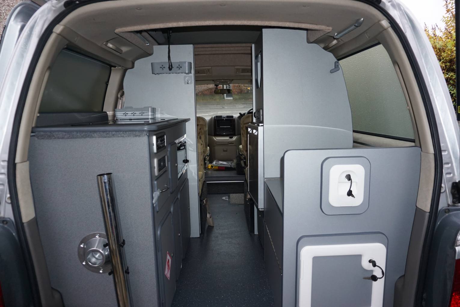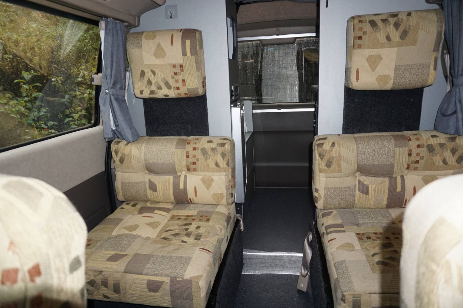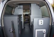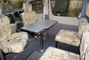 Pevril Conversion has 4 travelling seats with the front two swivelling to complete the dining/lounging area with table. Towards the rear is the kitchen with twin gas hob, grill,sink , fridge and a cassette toilet. A sliding door provides privacy to the rear