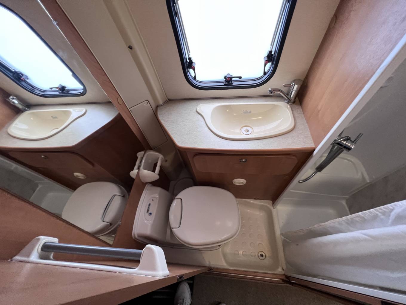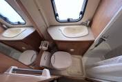 Opposite the kitchen is the bathroom where you will find a Thetford Cassette flush toilet, a wash handbasin, cupboard space and a separate shower cubicle.