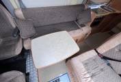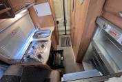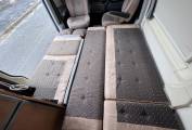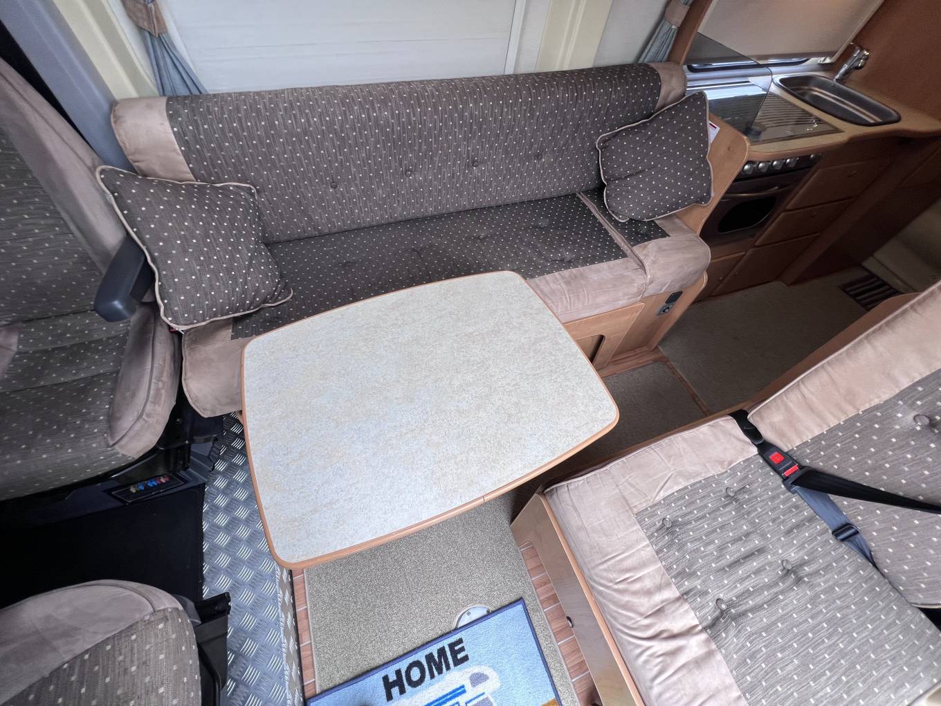 On entering via the large sliding side door, up the electrically powered step you enter the lounge and dining area, consisting of a long inward facing settee, a single chair on the door side and twin swivelling cab seats.