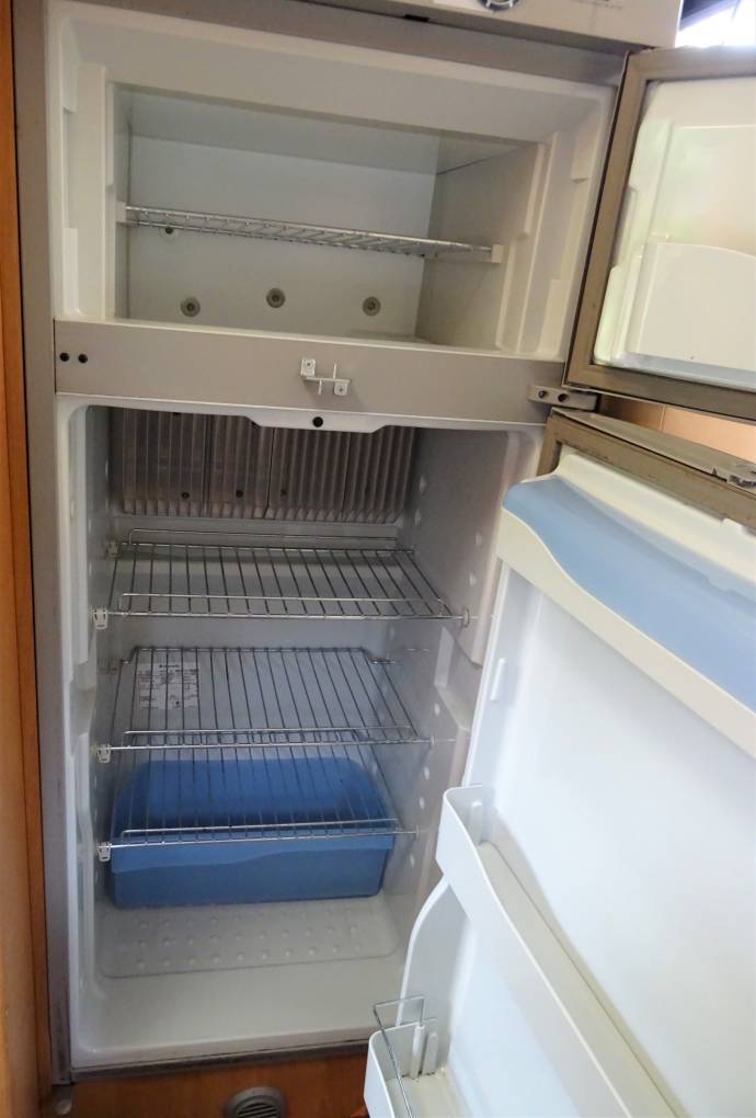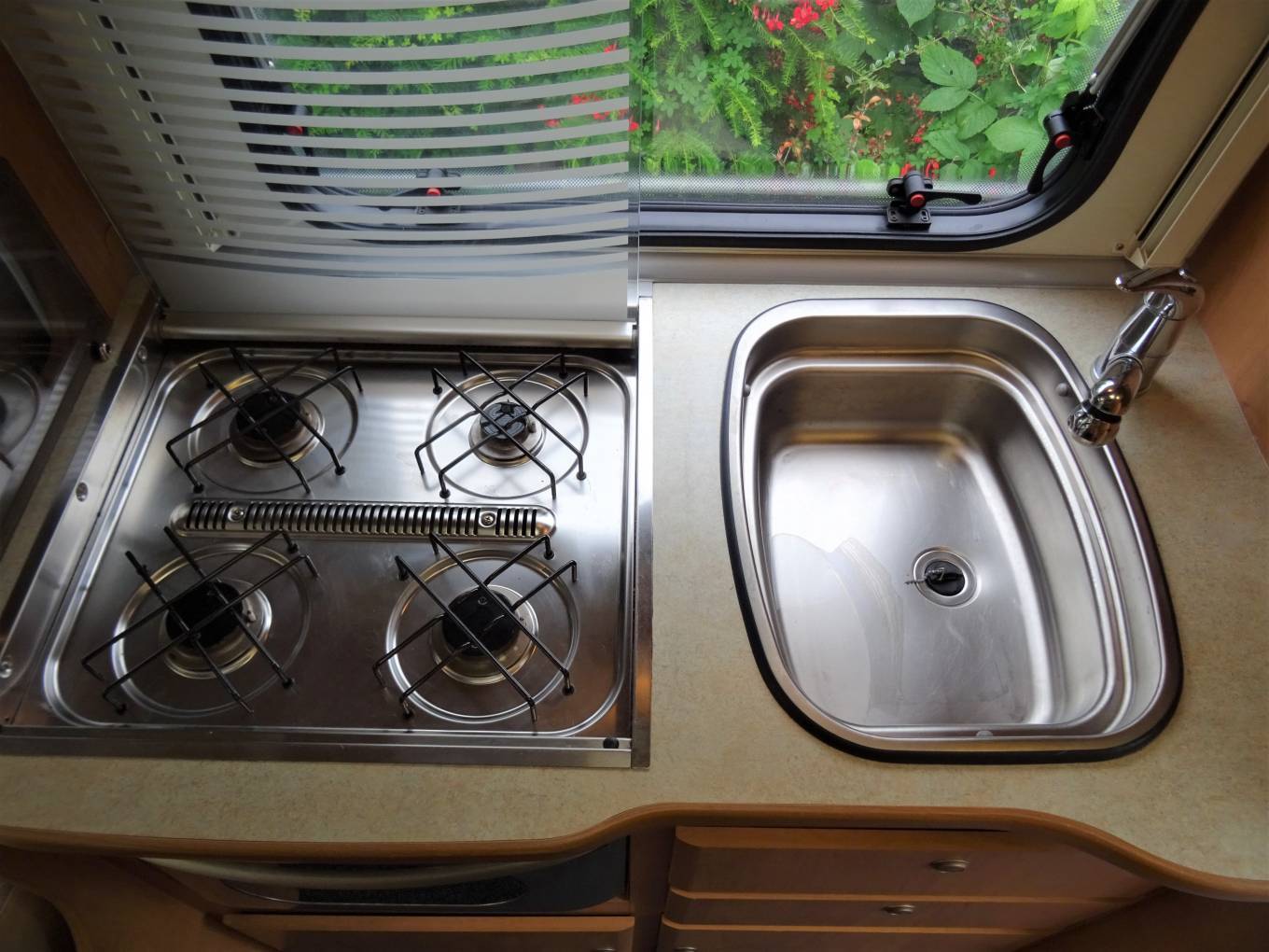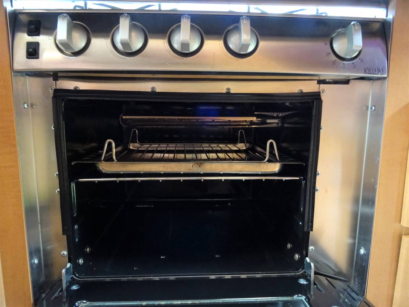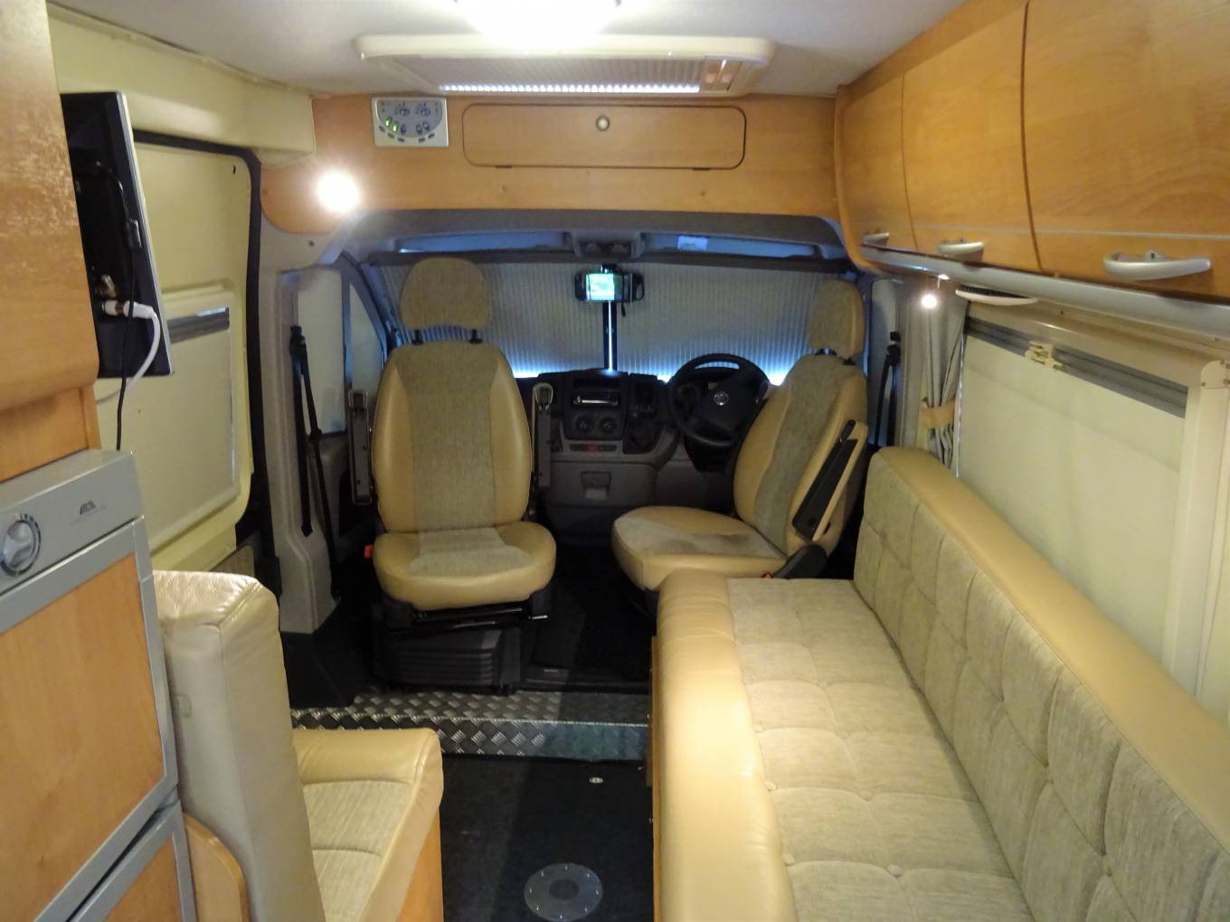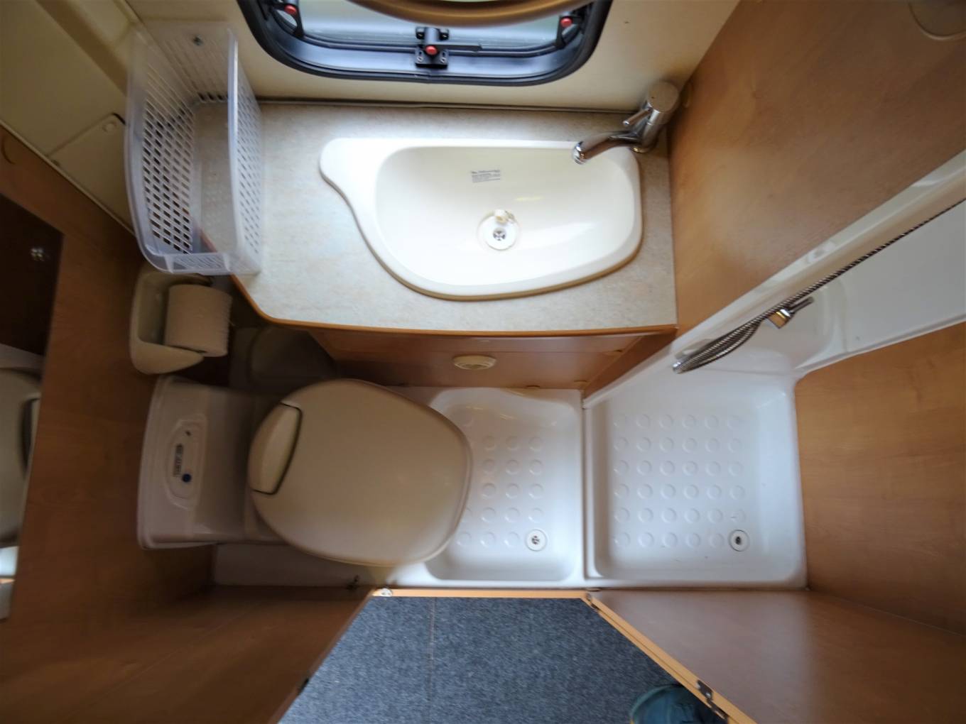On entering the habitation area, using the electric step, we have two captain chairs in the cabin area and a bench style seat immediately in front of you with a forward facing single seat to the left with a three point seat belt. Following along from the bench seating we have the kitchen area consisting of a four ring gas hob, oven and grill, a single bowl sink with mixer tap and opposite a large fridge with separate freezer. At the rear we have a washroom with a Thetford cassette toilet, a separate shower cubicle with a vanity wash basin and mixer tap and a large wardrobe opposite.