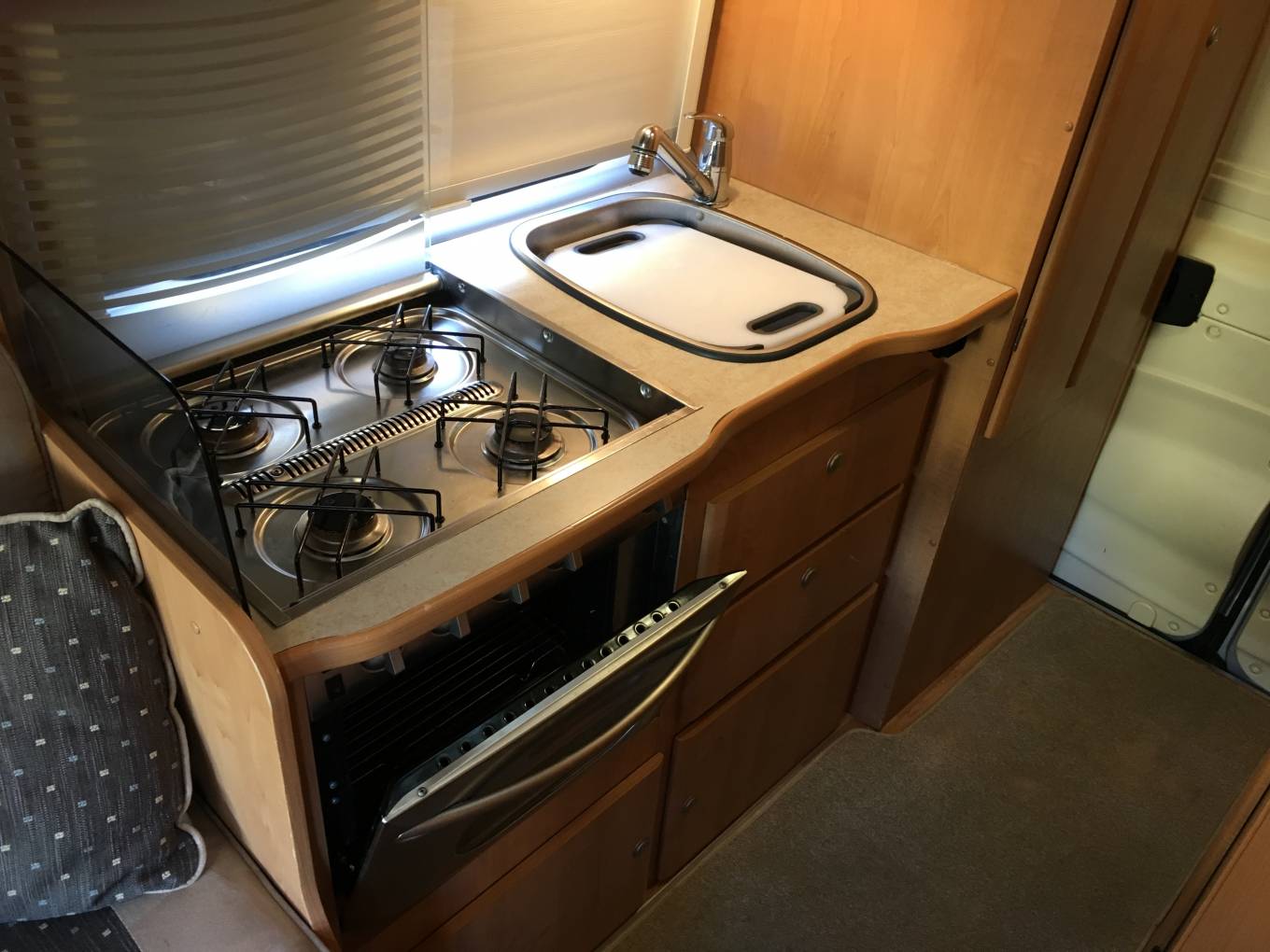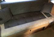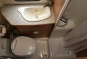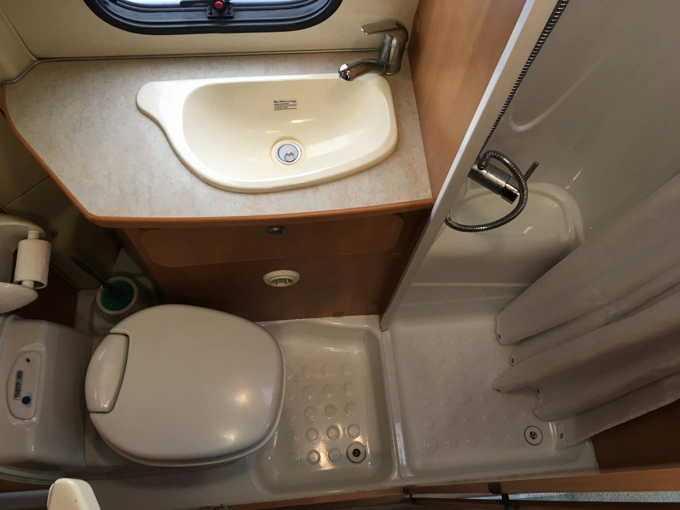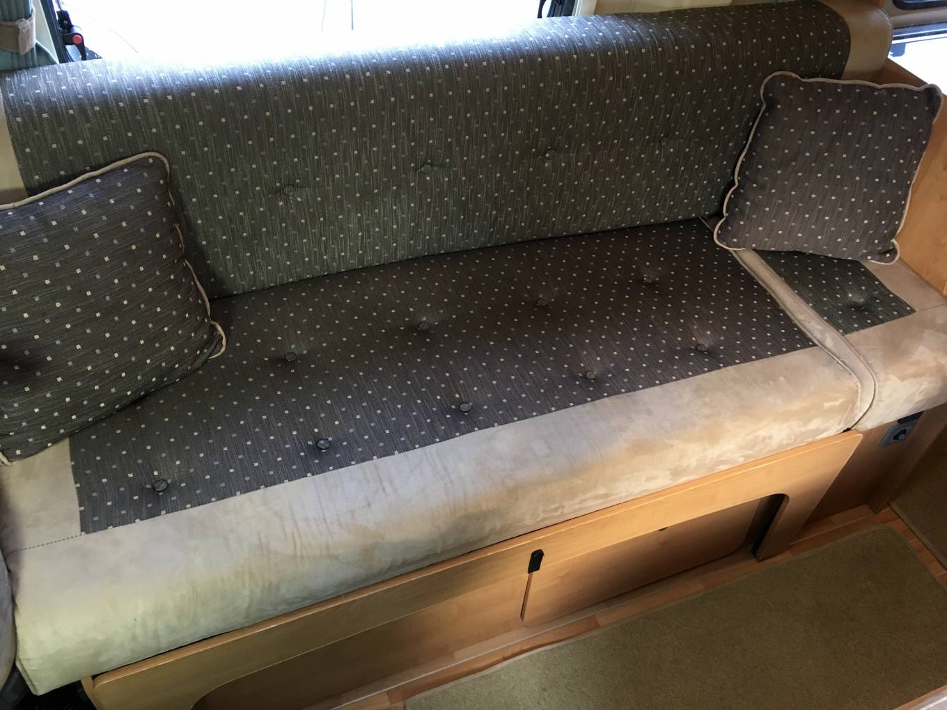 Outside there is a Fiamma F65 awning, electric entry step, good tyres, Carry Bike two bike rack, roof access ladder, gas locker including one bottle, access to toilet cassette, water inlet and a mains hook up point.