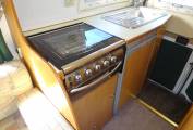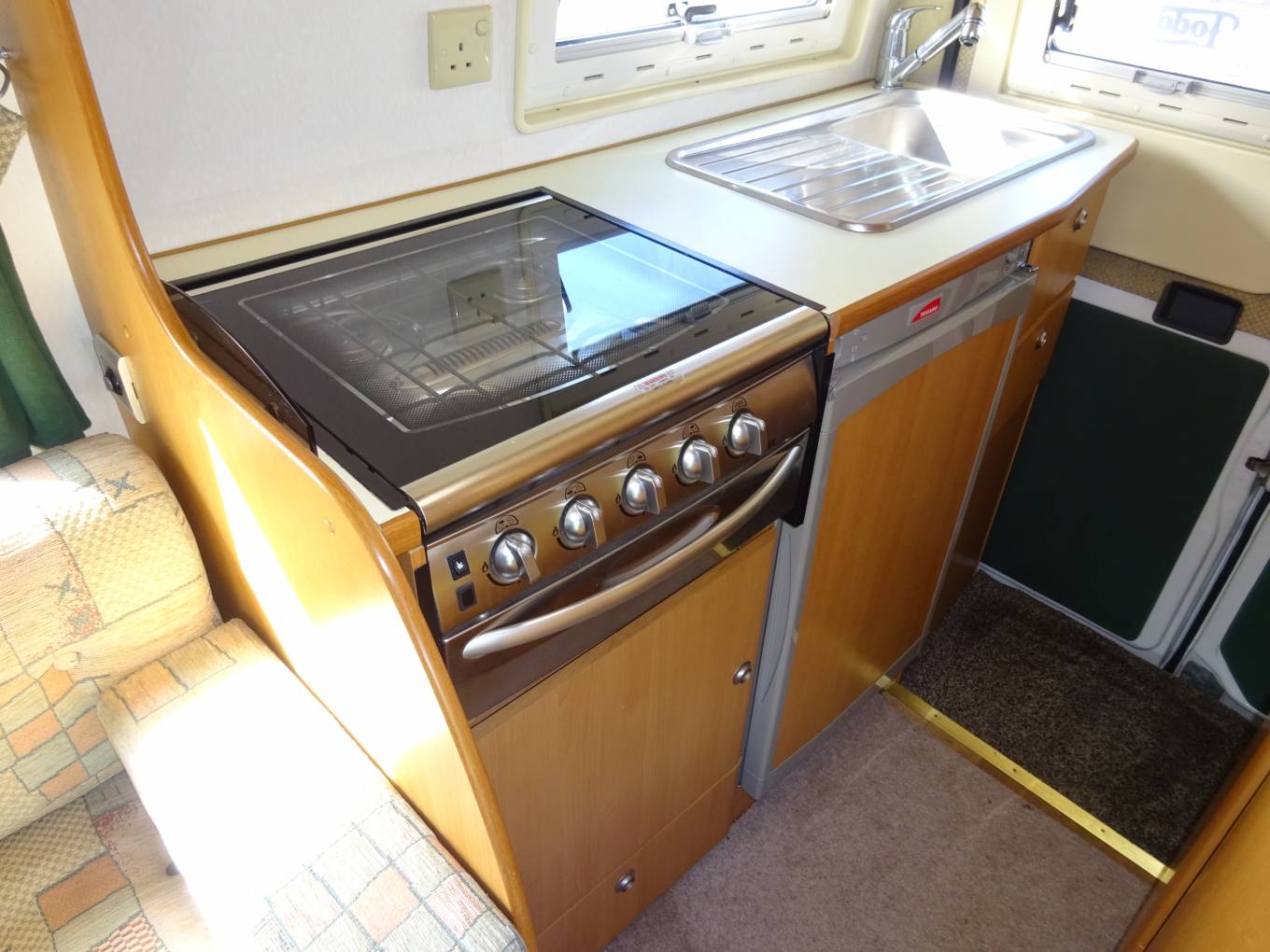 kitchen benefits from a 3-way fridge, grill, hob, sink and preparation area,