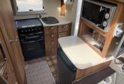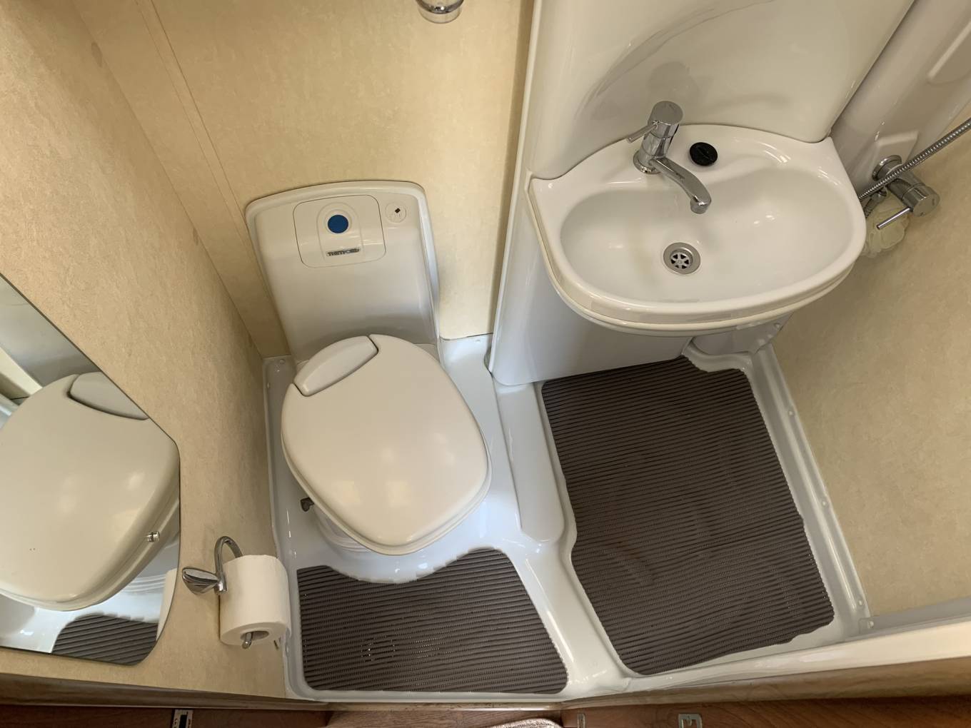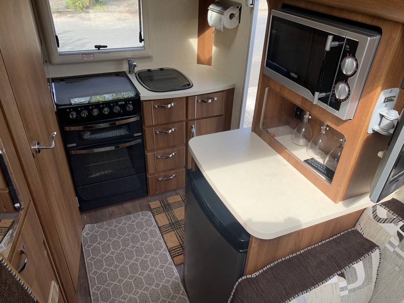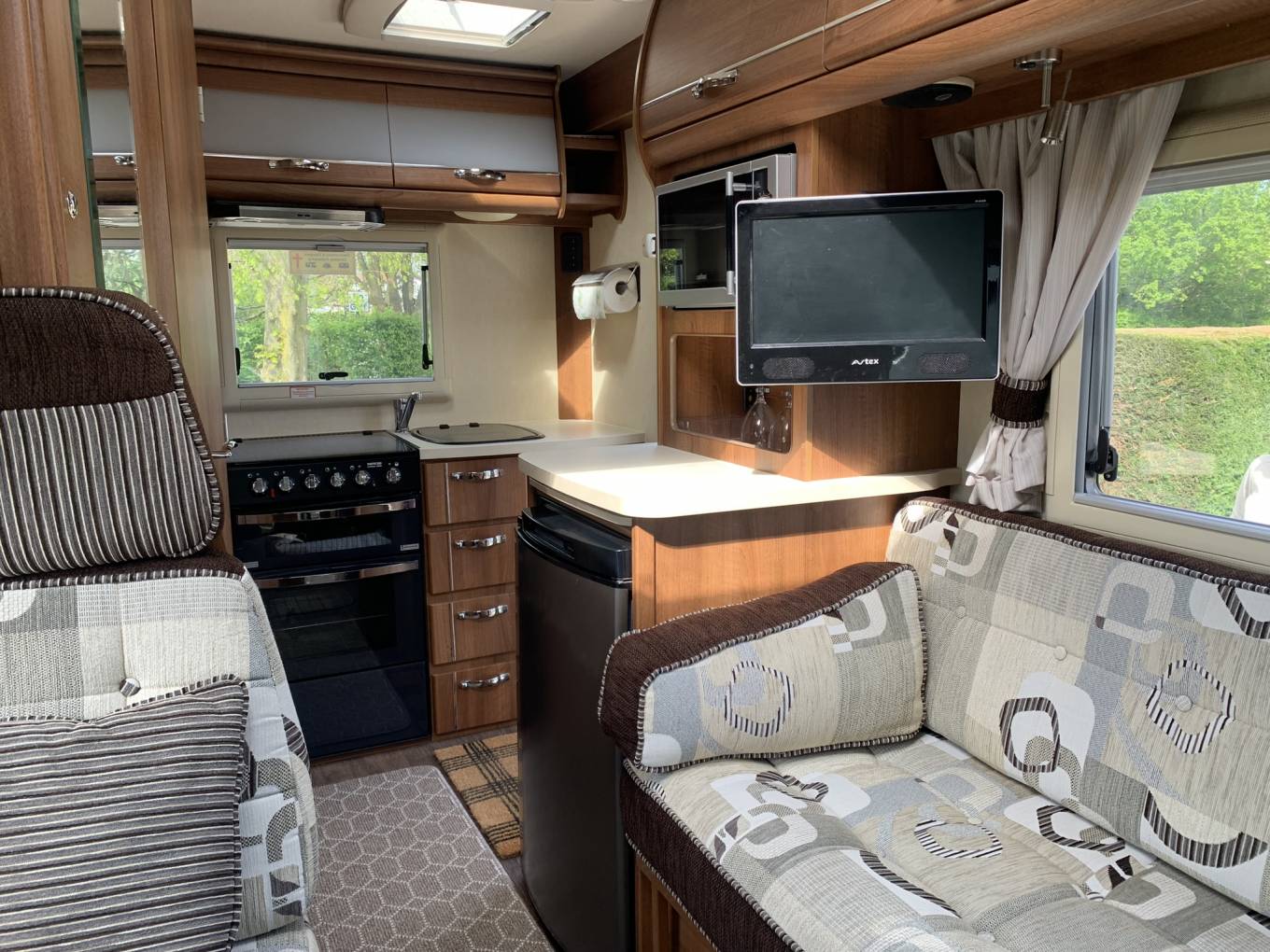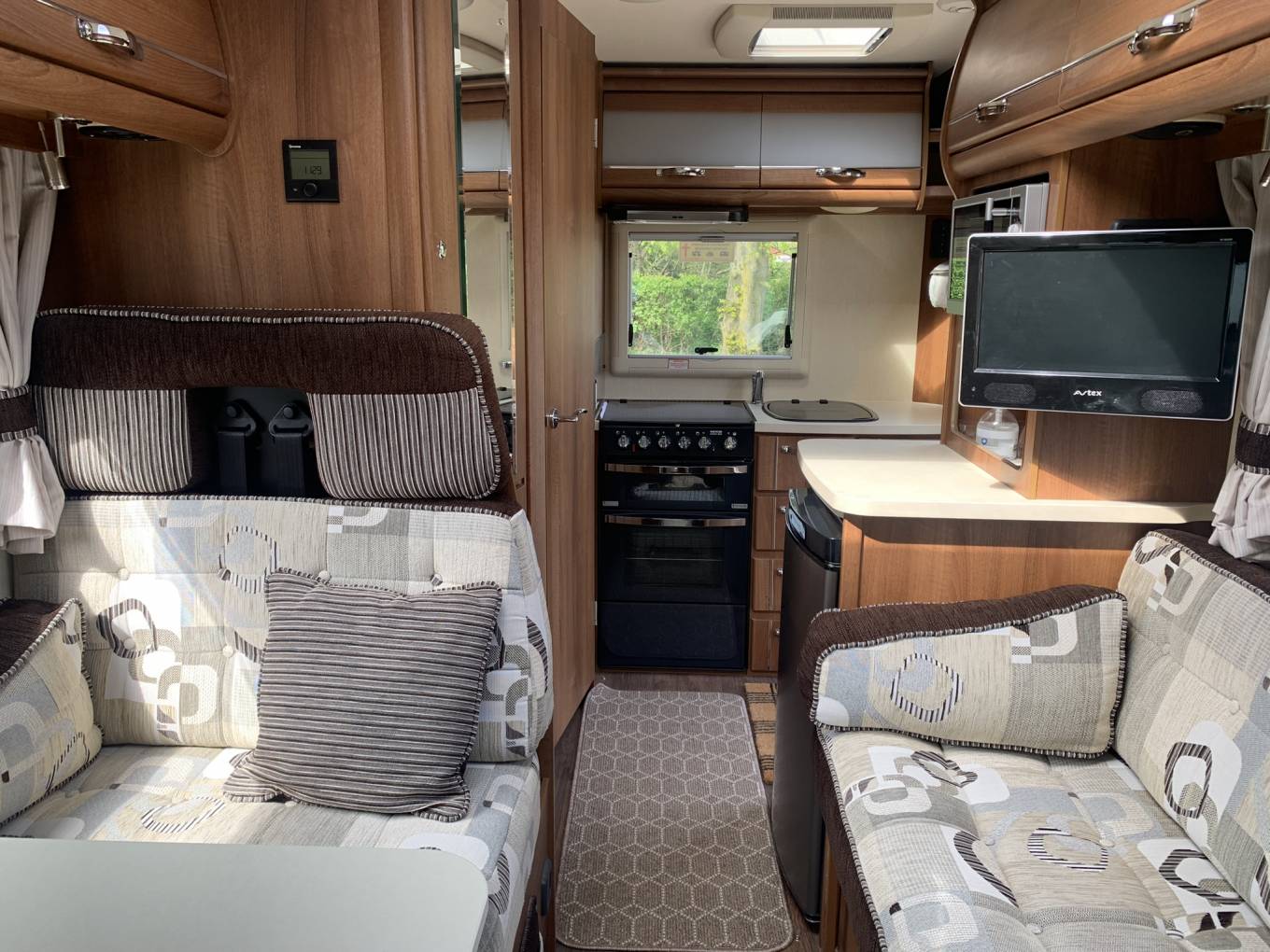 The layout of this motorhome is rear kitchen and washroom. Starting with the kitchen where there is a large Thetford Caprice oven with grille and 3 way gas hob and 1 electric, sink with storage overhead and underneath and a Dometic fridge with freezer compartment. Also at the rear adjacent to the kitchen is the washroom which includes a Thetford cassette toilet, sink with hot and cold taps and when the wall with the sink is pulled forward, it creates a full length separate shower.