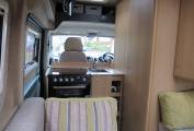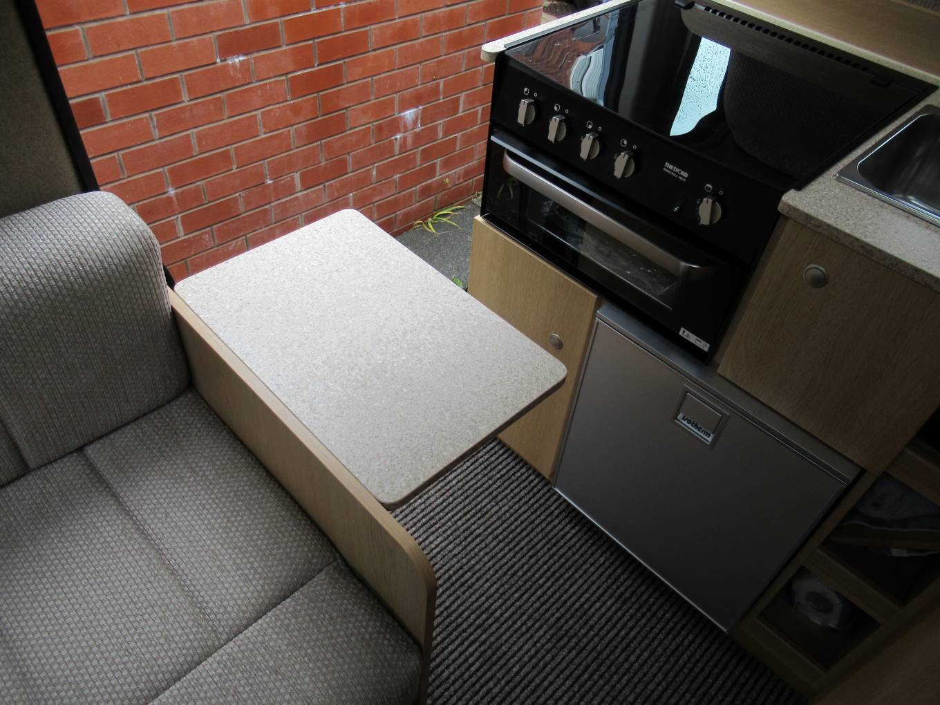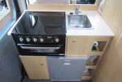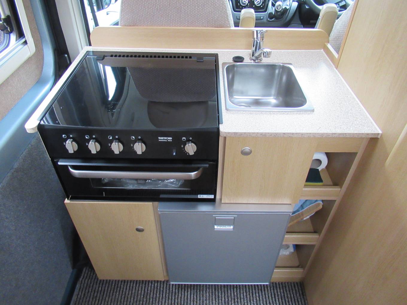 directly behind the passenger seat, the three burner hob and grill, sink and