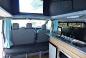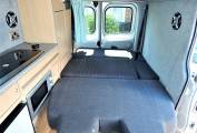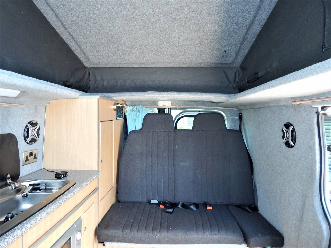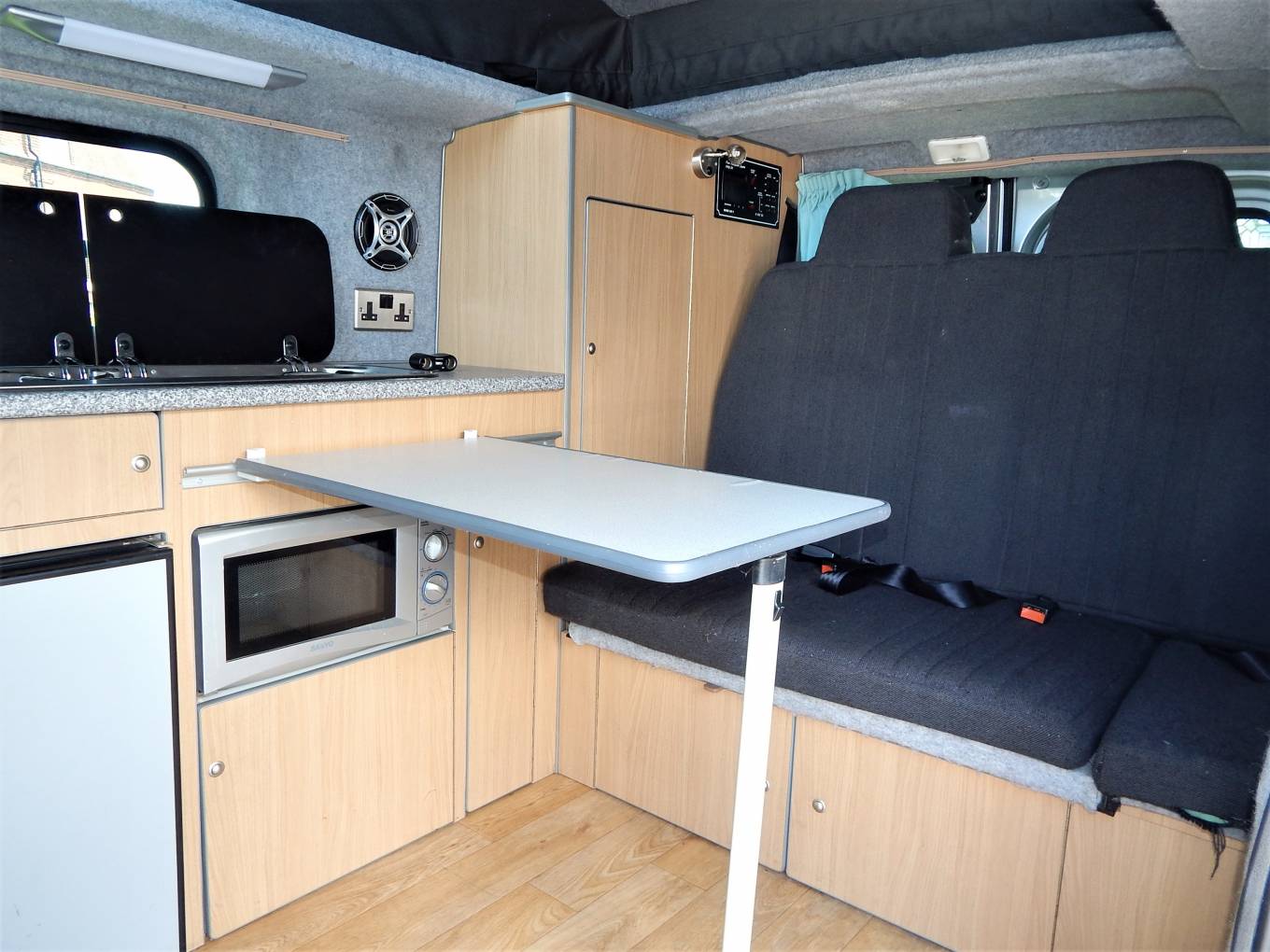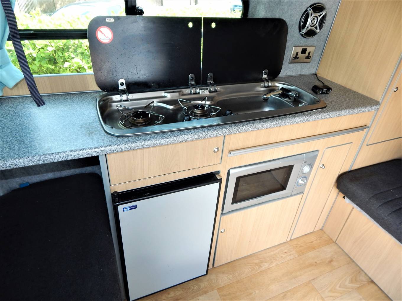 We enter the camper on the passenger side via a large sliding door, immediately opposite is a work surface incorporating a 2 burner gas hob and stainless sink with mixer tap. Below the surface is a Vitrifigo compressor fridge that runs on 12v, & a microwave oven. There is a rail for the dining table which has a foldable leg for stowing when not in use.