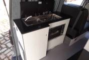 Both the front seats swivels to face the rear 2 travelling seats which pull forward to make either two single beds or a large double bed with storage around each side and underneath. Above this in the roof is another large double bed which can hold up to 100-120kg in weight. The base of the roof bed also pushes up to allow for more head room when not in use. Around the Camper there are several drawers and storage cupboards so you are never short of space.