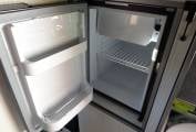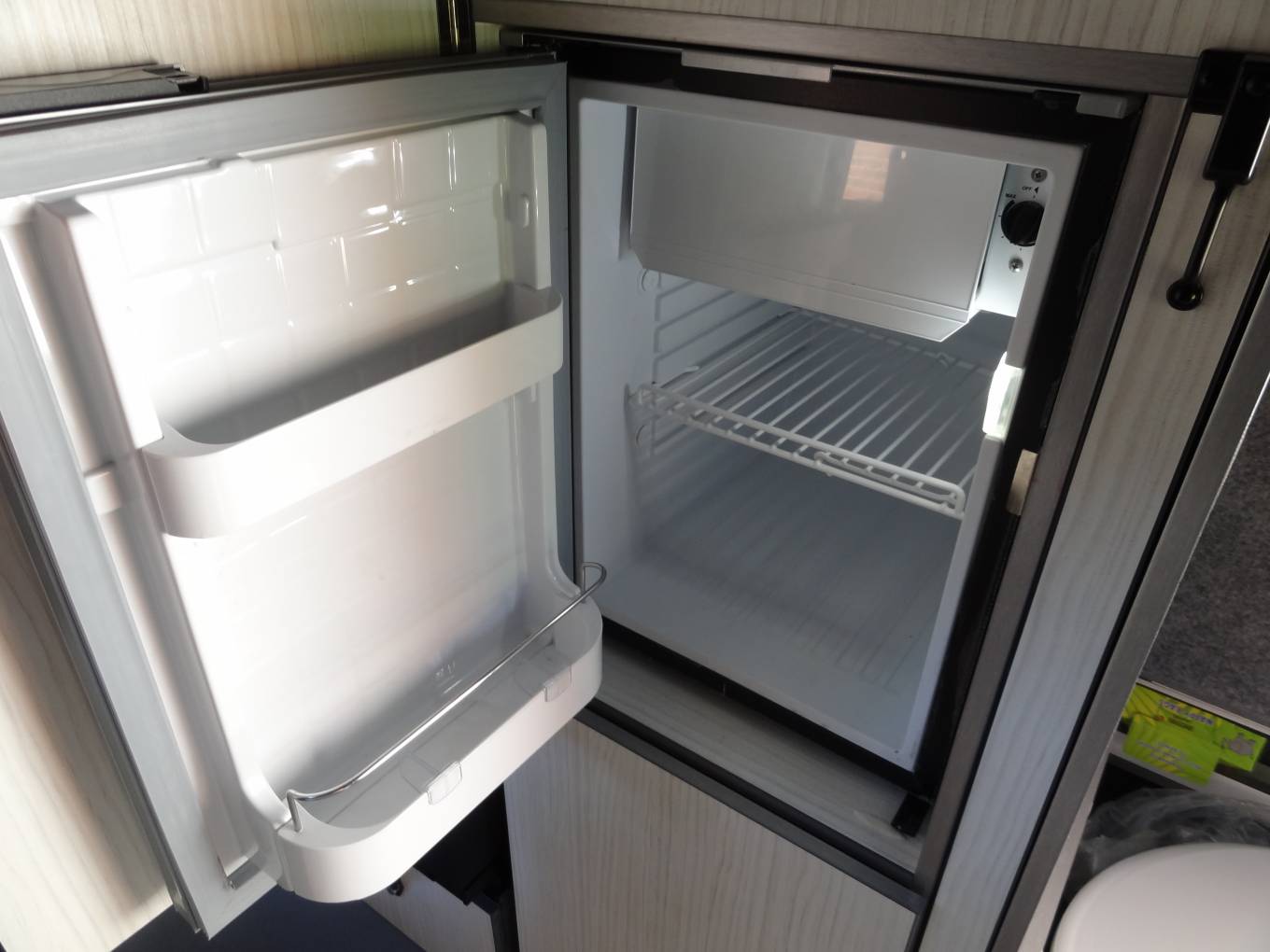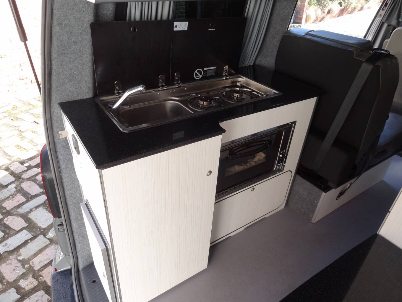This camper has a rear kitchen that offers a 2 ring gas hob and oven supplied by the gas bottle located underneath. There is also a good sized fridge with freezer compartment. In this area, adjacent to the sink is an additional worktop area where you can lift the lid to reveal the onboard toilet which has the removable cassette located behind the unit.