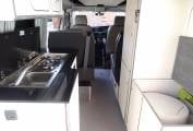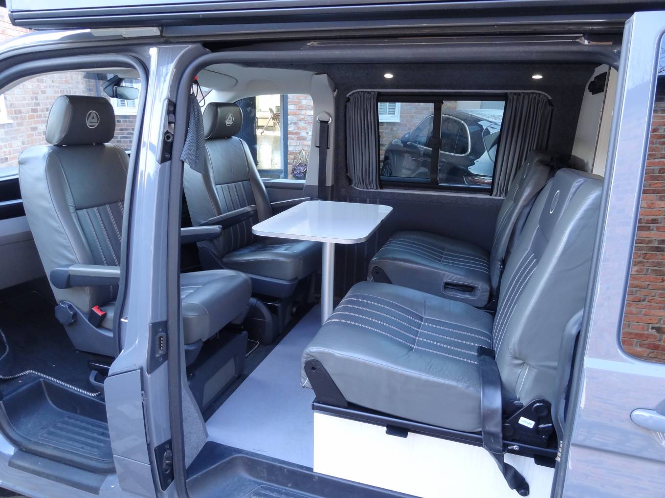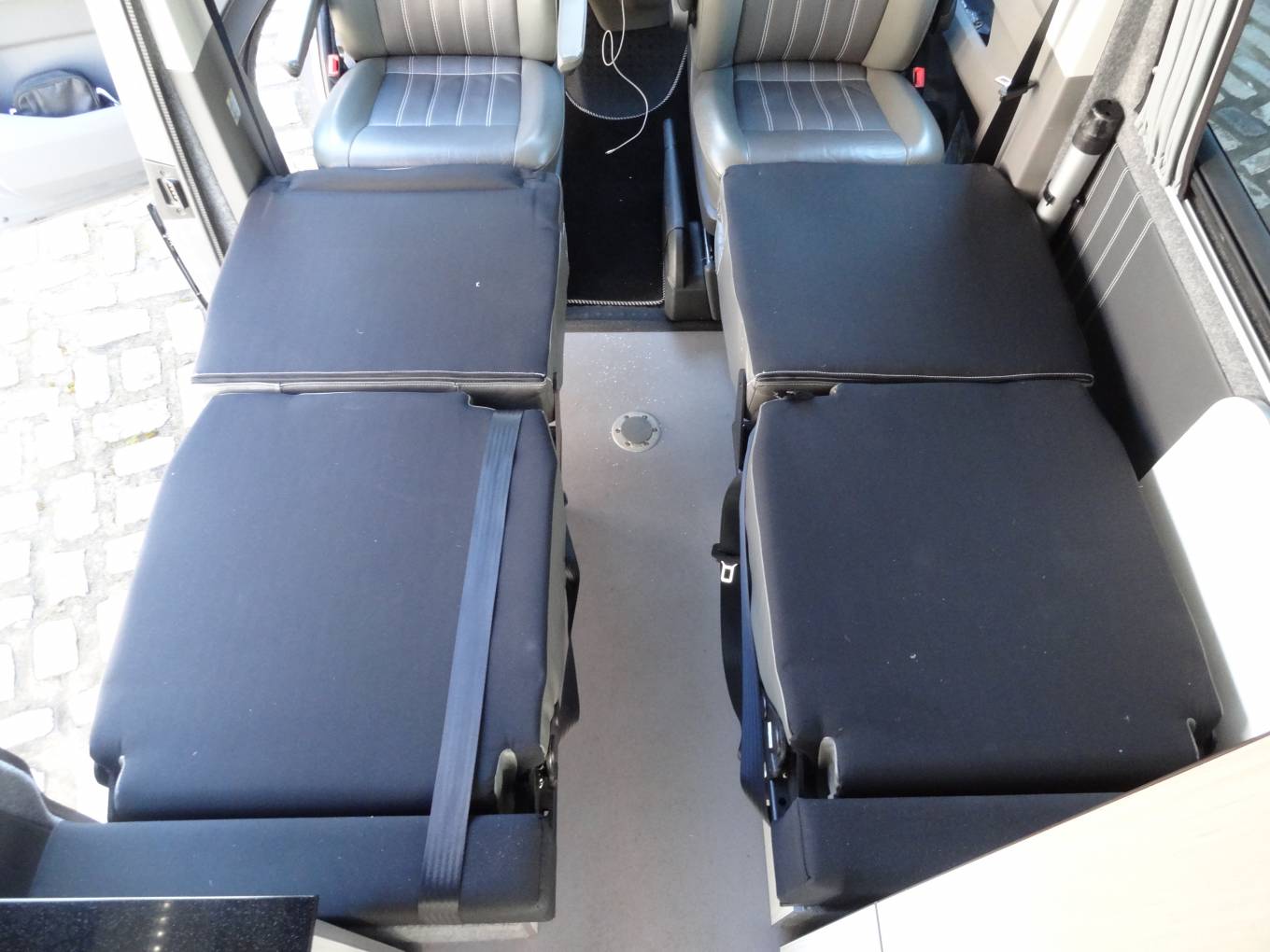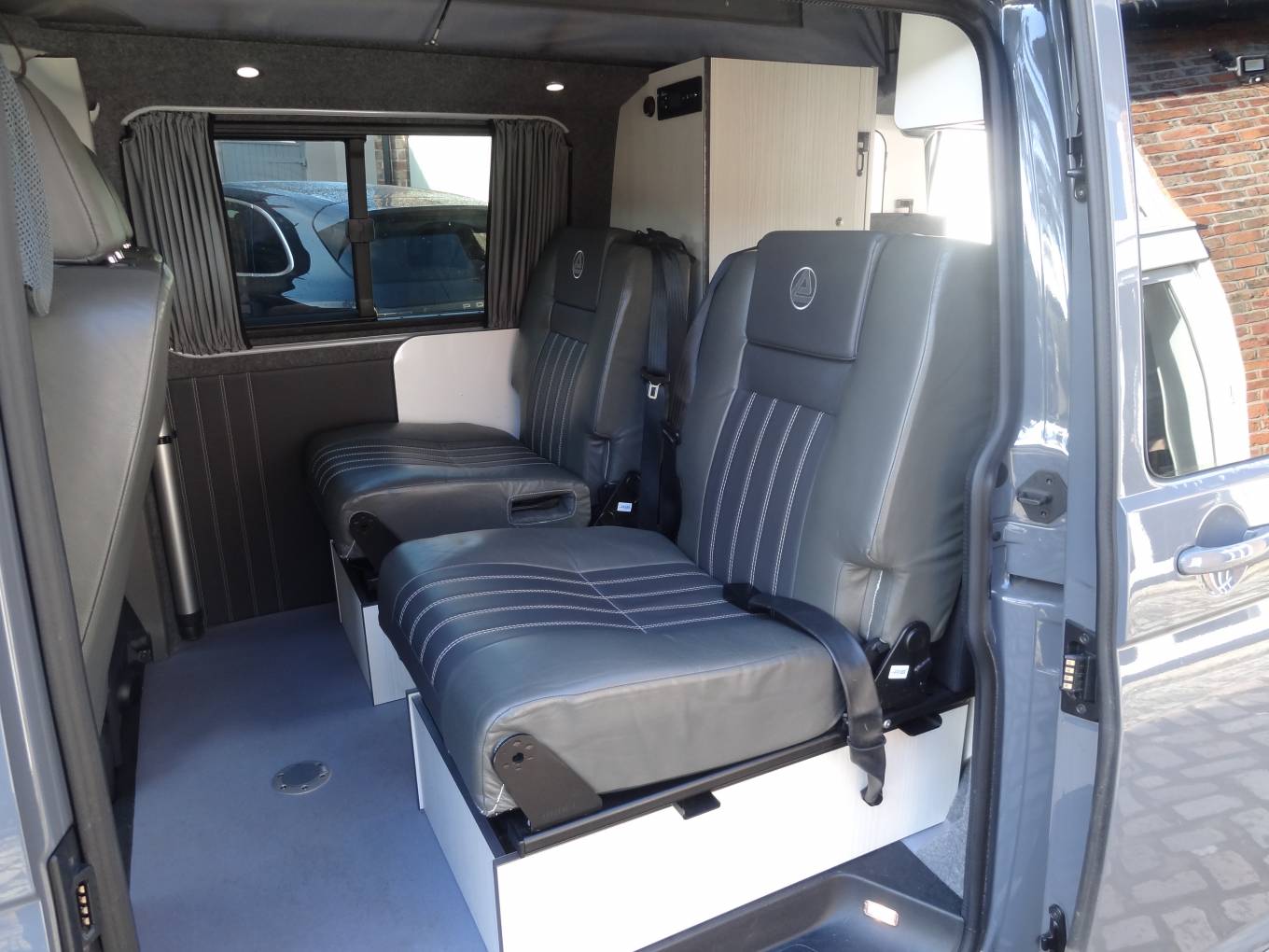 This high level quality conversion offers a 4 berth sleeping capacity along with 4 travelling seats. The cab which boasts 2 of the travelling seats also has the 2 swivel chairs that can be turned around to face the centre dinette and the remaining 2 travelling seats along with a table centred in the middle. In the Cab there is a touch screen interface which includes dab radio, Apple/Android car play, bluetooth phone, reversing camera along with with electric windows, mirrors and air conditioning.