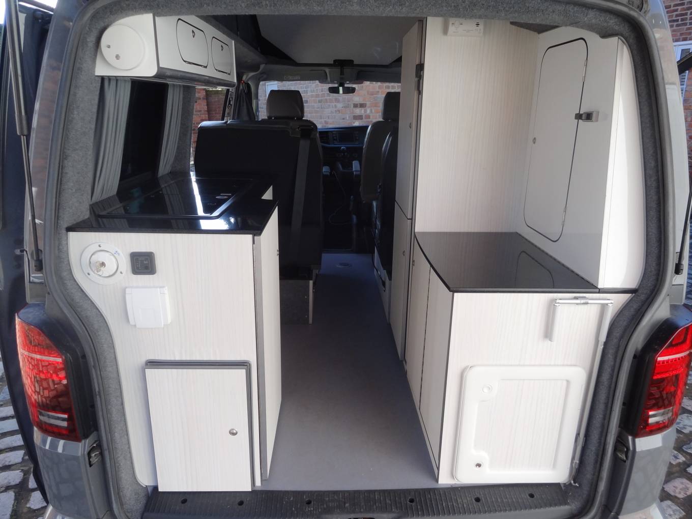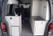Both the front seats swivels to face the rear 2 travelling seats which pull forward to make either two single beds or a large double bed with storage around each side and underneath. Above this in the roof is another large double bed which can hold up to 100-120kg in weight. The base of the roof bed also pushes up to allow for more head room when not in use. Around the Camper there are several drawers and storage cupboards so you are never short of space.