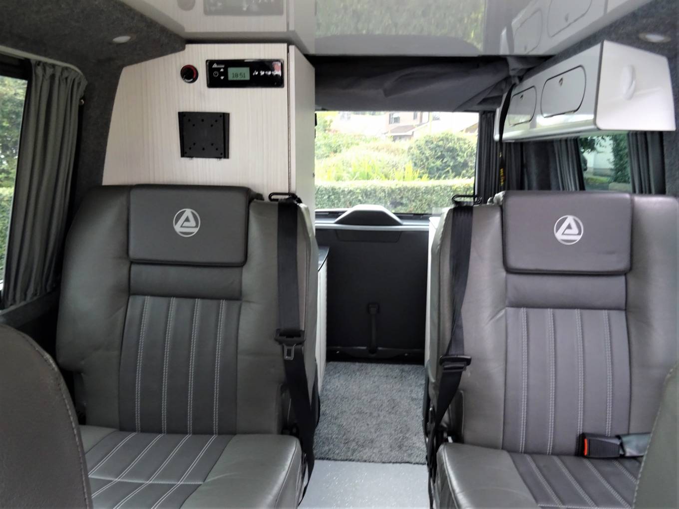 This high level quality conversion offers a 4 berth sleeping capacity along with 4 travelling seats. The cab which boasts 2 of the travelling seats also has the 2 swivel chairs that can be turned around to face the centre dinette and the remaining 2 travelling seats along with a table centred in the middle. In the Cab there is a touch screen interface which includes dab radio, Apple/Android car play, bluetooth phone, reversing camera along with with electric windows, mirrors and air conditioning.