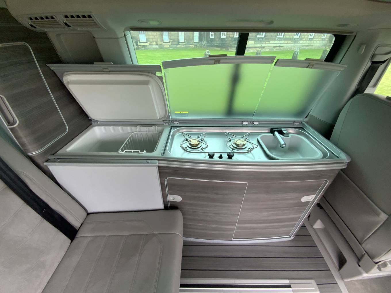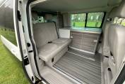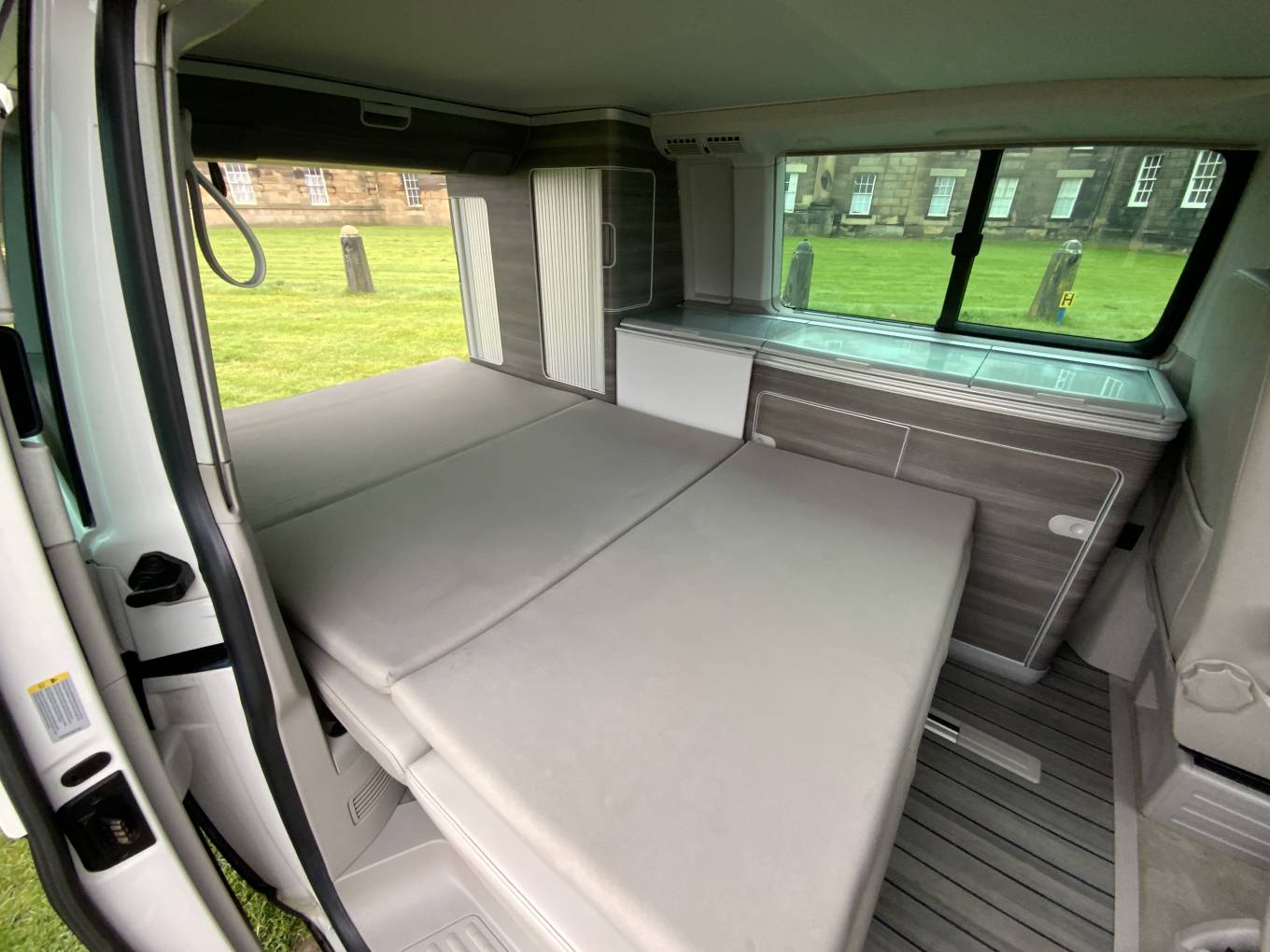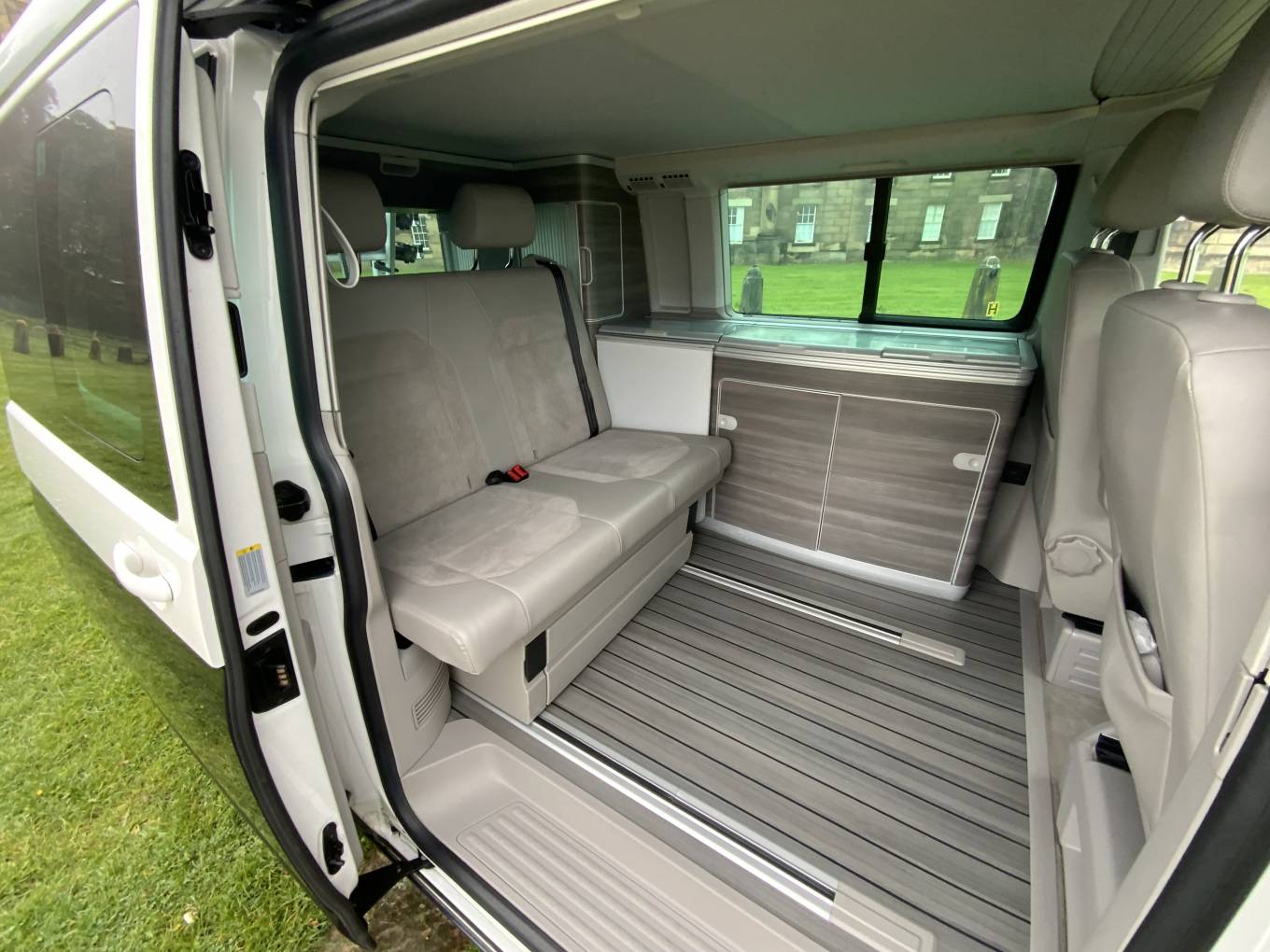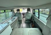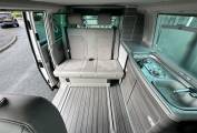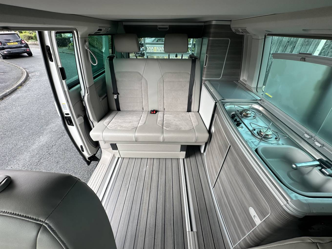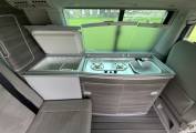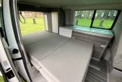 This Campervan is converted to the highest standard and really needs to been seen to be appreciated. The two tone paint sets it apart from others available and the grey interior oozes luxury. Entering through the electric sliding door you are greeted by the grey wood effect units which houses a combination sink and hob, chest fridge and ample storage. The comfortable fold down bed features two additional 3 point seat belts, allowing 4 people to travel safely in comfort. The second sleeping area is in the pop top roof complete with foam mattress.